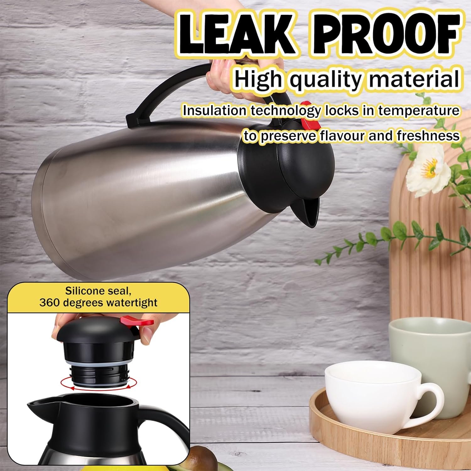 Double Walled Vacuum Design: the double wall vacuum carafe design of this stainless steel coffee carafe insulates the interior, keeping your drink’s temperature for around 24 hours, preventing heat or cold from escaping for maximum temperature retention; This feature allows you to prepare your preferred drink in advance while preserving its ideal serving temperature; The kettle features a push to open/ close mechanism. Pour easily with just a button, allowing you to pour water with one hand