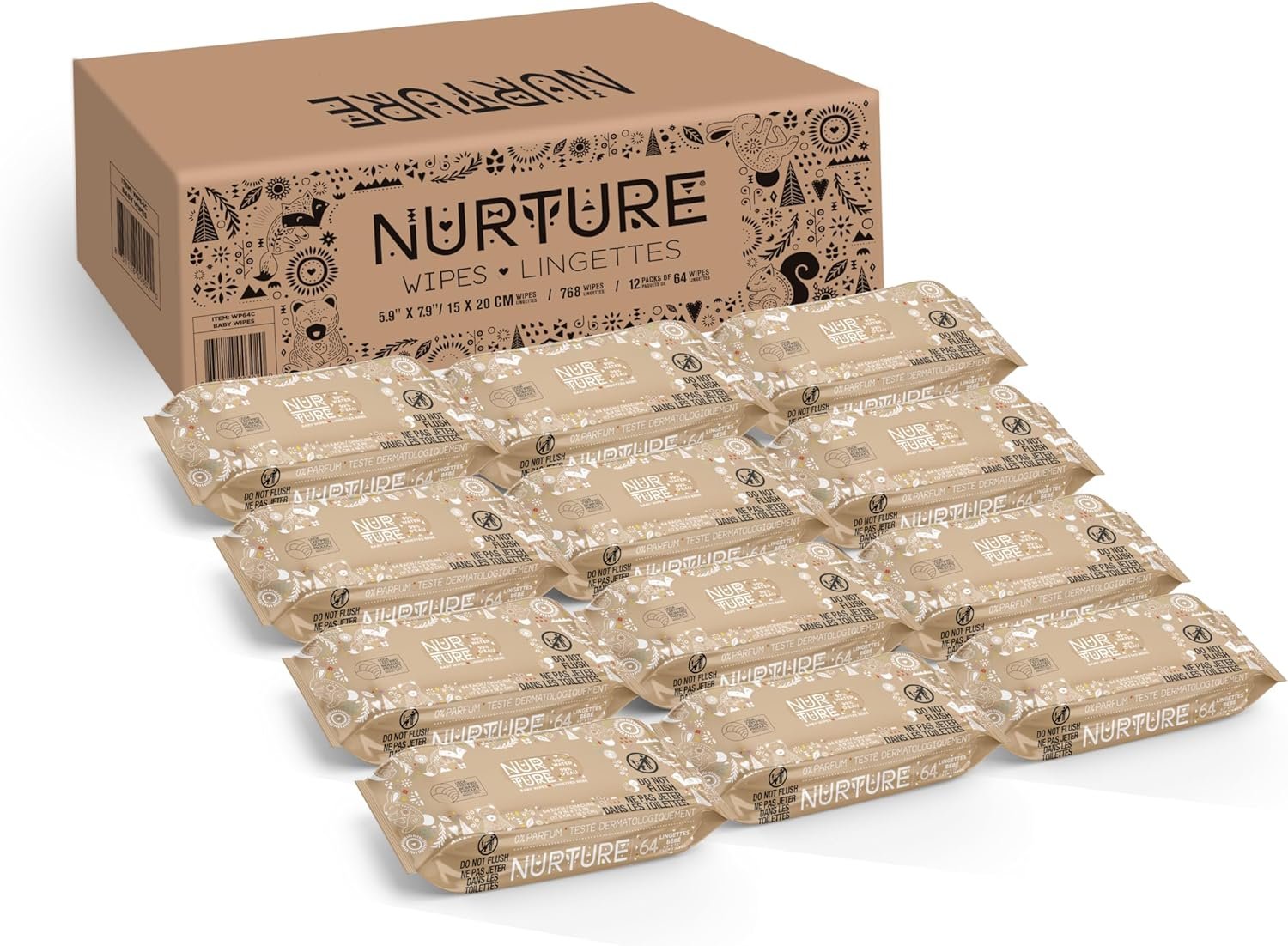 Contains 12 packs of 64 count wet wipes (768 total), Wipe size: 6.9 x 7.3 inches