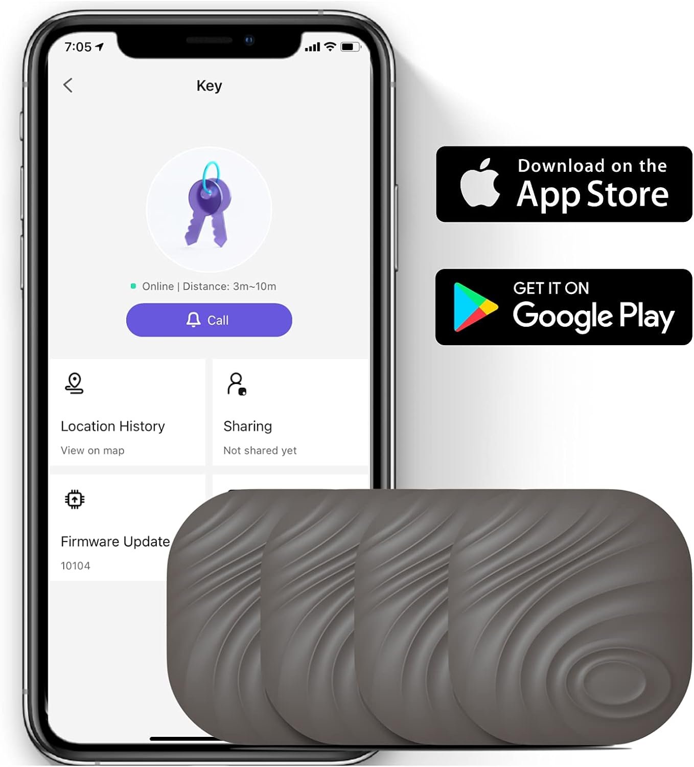 ►【One Touch Find】The key finder that makes music helps you find misplaced items quickly; Click the “CALL” on the App to make your key finder ring and find anything quickly.