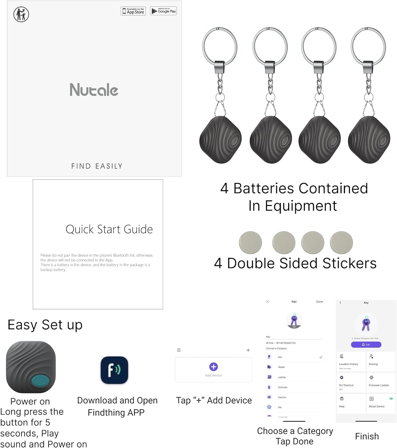 ►【Easy Setup】Power on(Long press the Device’s button for 5 seconds, Play sound and Power on)—> Download and Open Findthing APP —> Tap “+” Add Device —> After Choose a Category, Please Tap “Done” —> Finish (You can Tap “Call” to ring your device)