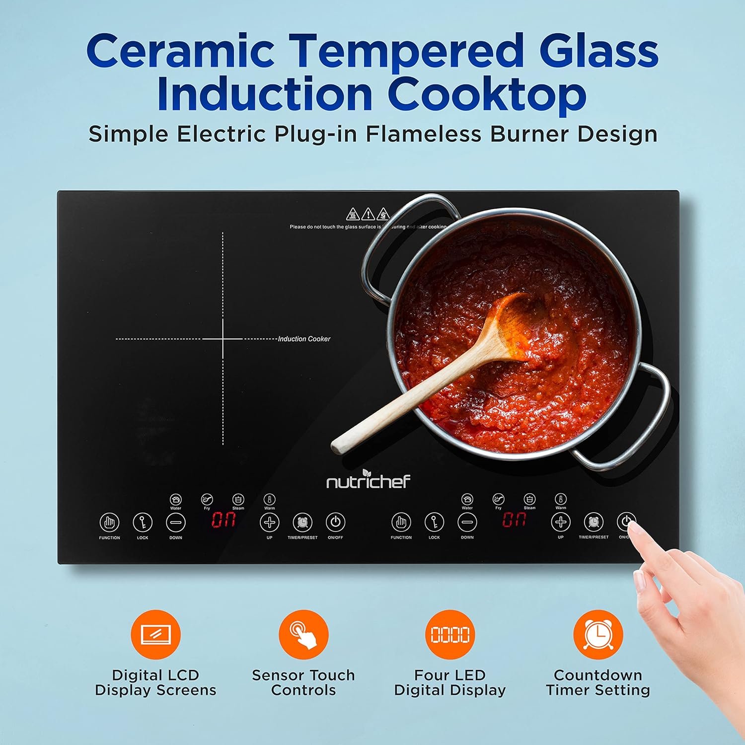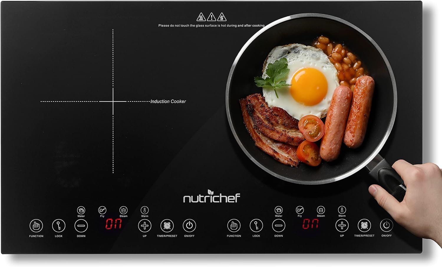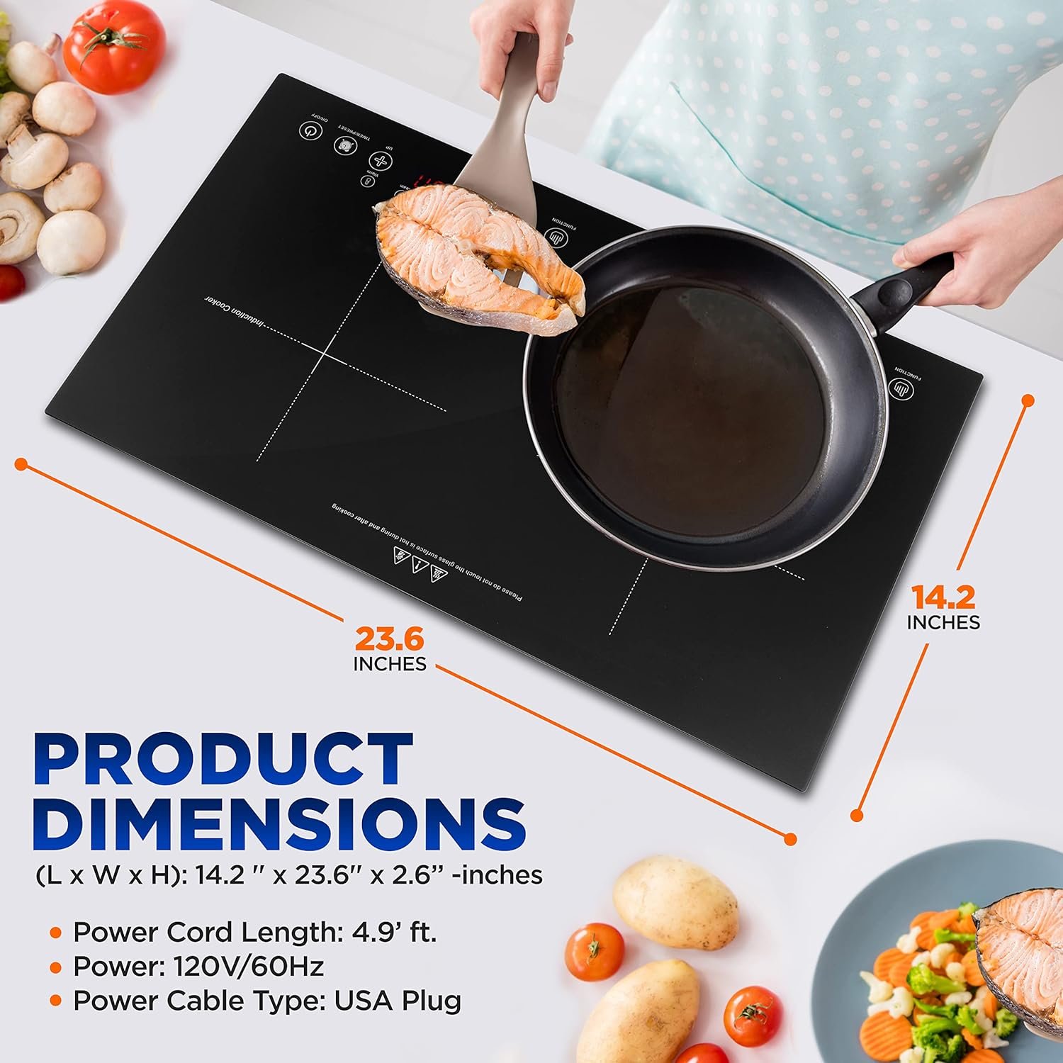 Features: – Ceramic Tempered Glass Induction Cooktop – Simple Electric Plug-in Flameless Burner Design – (2) Circular Top Panel Heating Zones – Independent Configurable Temperature Zone Setting – High-Powered Heating Elements – Quickly Heats for Instant Food Prep – Digital LCD Display Screens – Sensor Touch Controls – Four LED Digital Display – Countdown Timer Setting – Stain-Resistant & Easy-to-Clean – Compact & Space-Saving Style – Energy Efficient: Low Power Consumption – Safety Certified & Approved – 4 Intelligent Cooking Function – 8 Levels Temperature Setting – 4 Hours Timer Function – 23:59 Hours Preset Function – Child Safety Lock Function – Without Pot – For Use with All of Your Steel Kitchen Cookware, Pots & Pans What’s in the Box: – Double Burner Induction Cooktop Technical Specs: – Dual Heating Element Power: 1800Watt x 2 Total 1800W by Power Shared – Circular Heat Zone Diameter: 6.7’’ -inches (-Each) – Max. Timer Setting: Up to 4 Hours – Construction Materials: Tempered Ceramic Glass, Engineered ABS – Power Cord Length: 4.9’ ft. – Power: 120V/60Hz – Power Cable Type: USA Plug – Plate Size: 14.2 ” x 23.6” -inches – Product Dimensions (L x W x H): 14.2 ” x 23.6” x 2.6’’ -inches