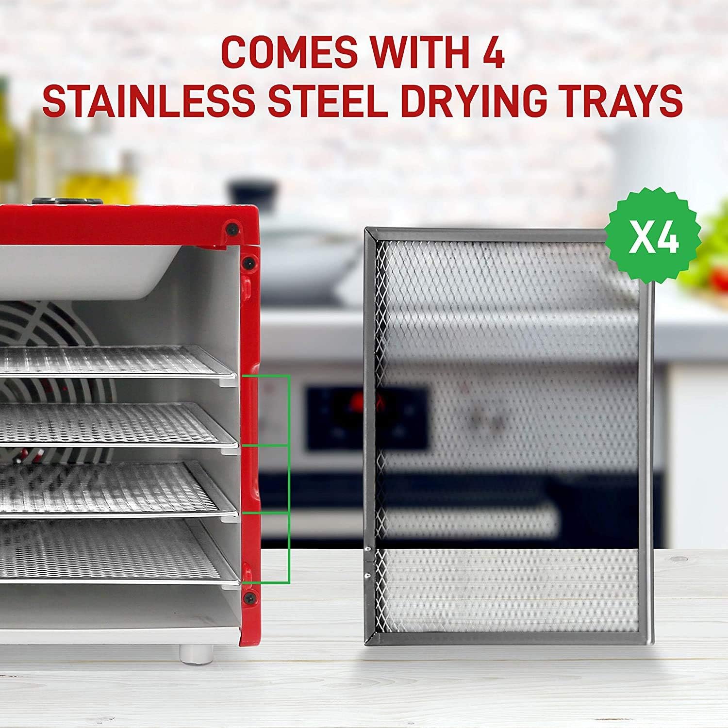 4-TIERED DRYER TRAYS: Comes w/ 4 food grade stainless steel trays or dryer rack. Can also be used to dry food without the use of the dehydrator. Since the trays are removable, they are very easy to clean along with the dehydrator machine
