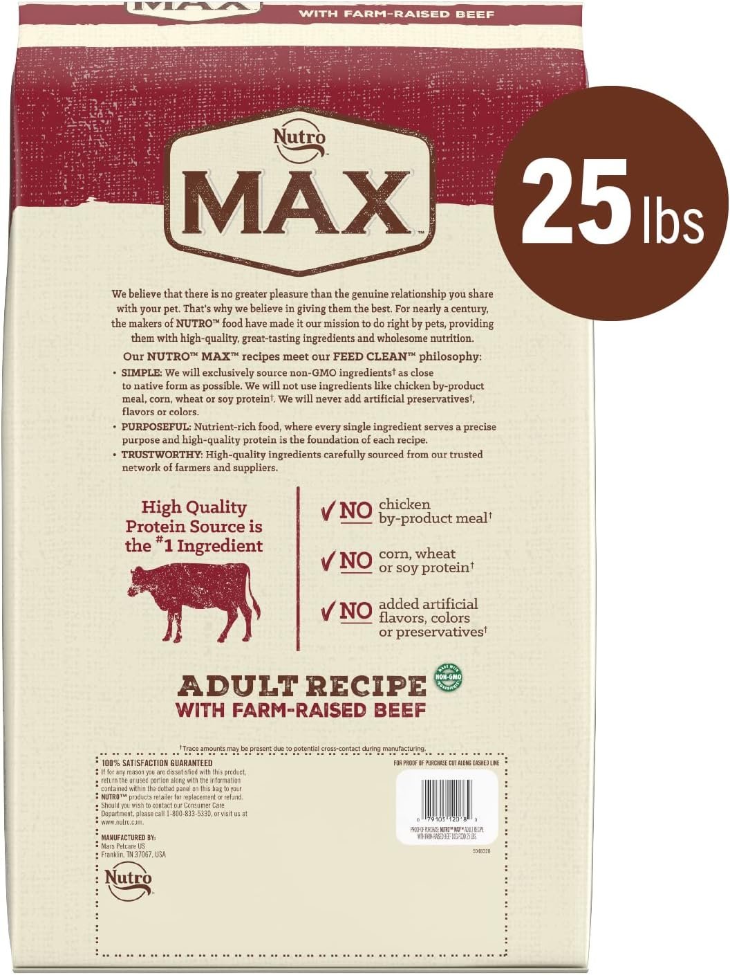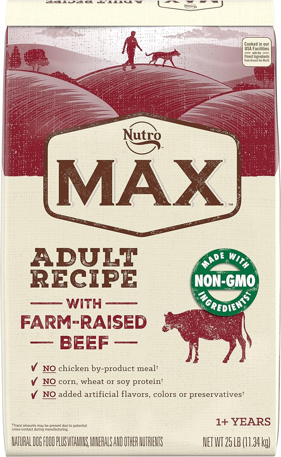 25 LB Bag: Contains 1 25 LB bag of NUTRO MAX Adult Recipe Dry Dog Food With Farm Raised Beef