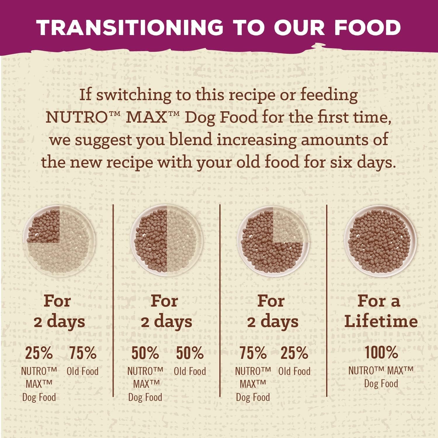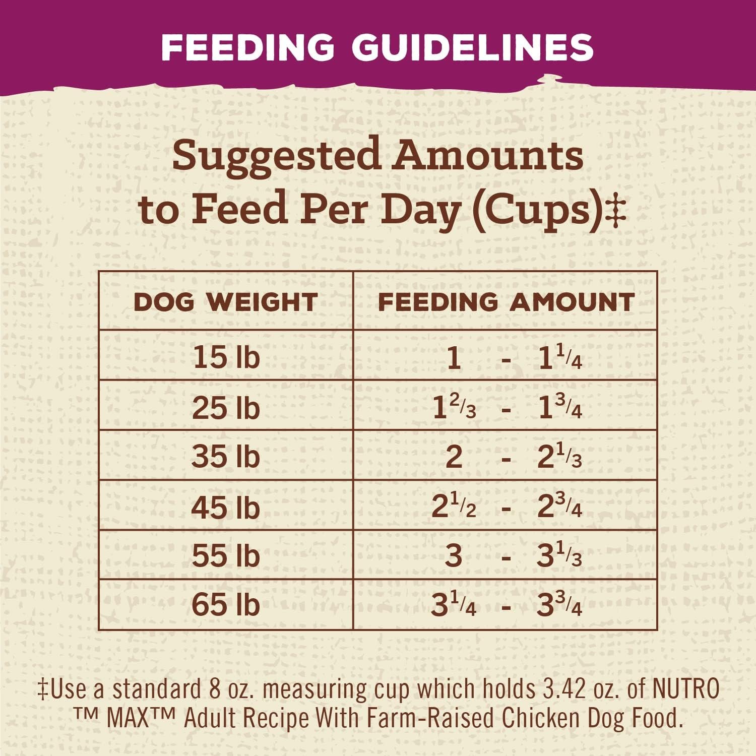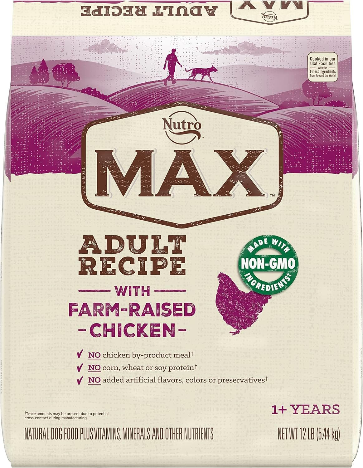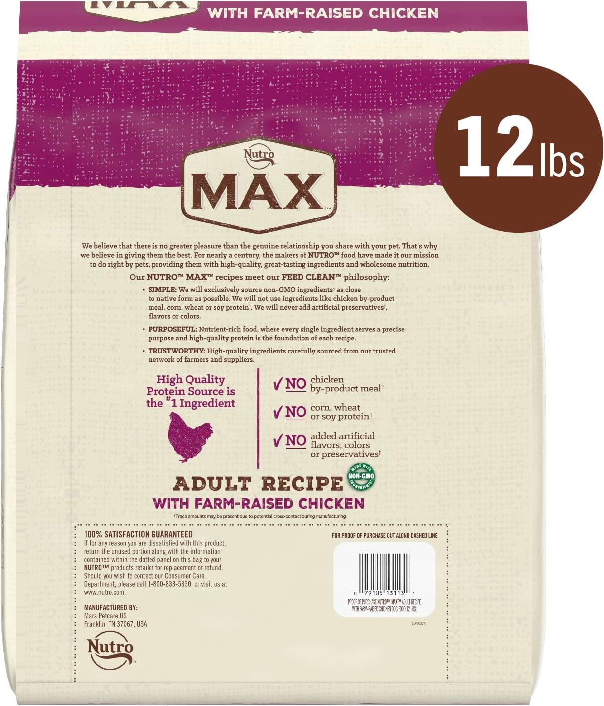12 LB Bag: Contains 1 12 LB bag of NUTRO MAX Adult Recipe Dry Dog Food With Farm-Raised Chicken