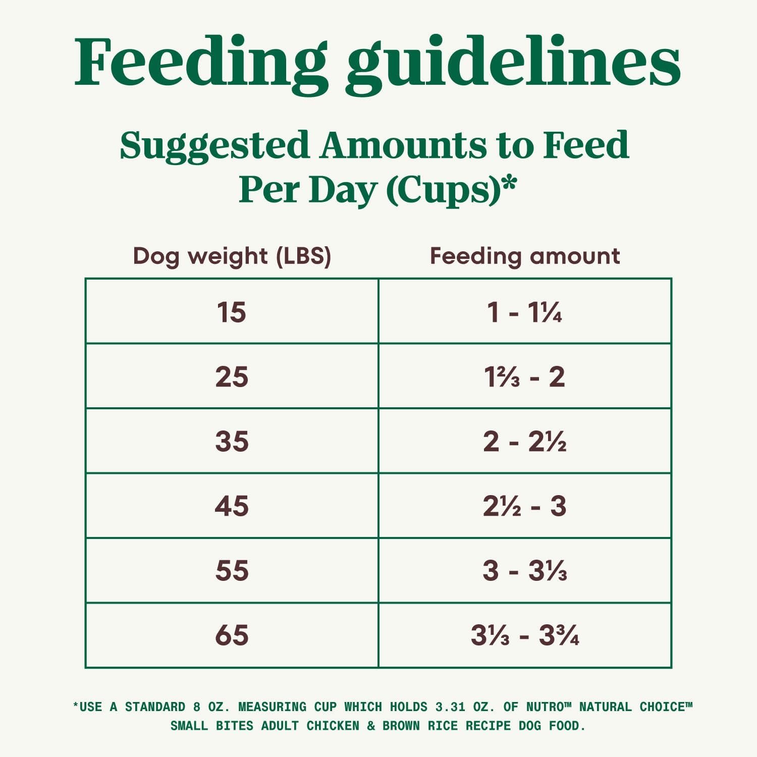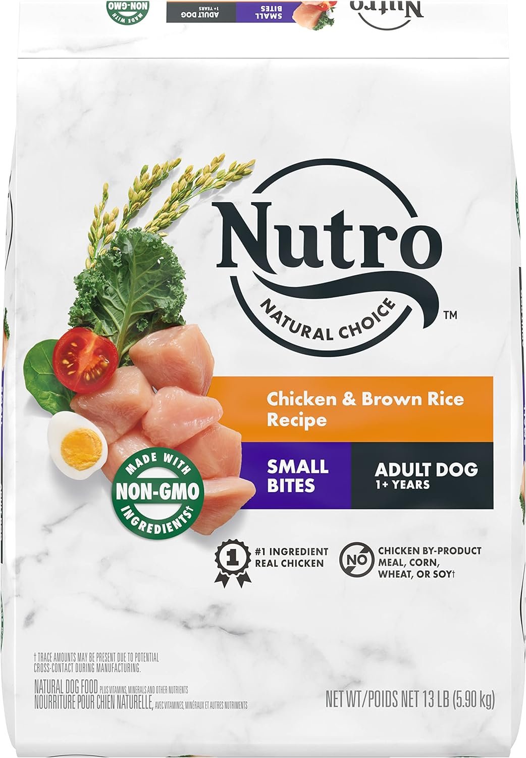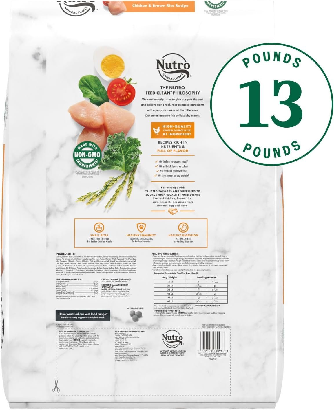 13 lb. Bag: Contains one (1) 13 lb. bag of NUTRO NATURAL CHOICE Small Bites Adult Dry Dog Food, Chicken & Brown Rice Recipe Dog Kibble