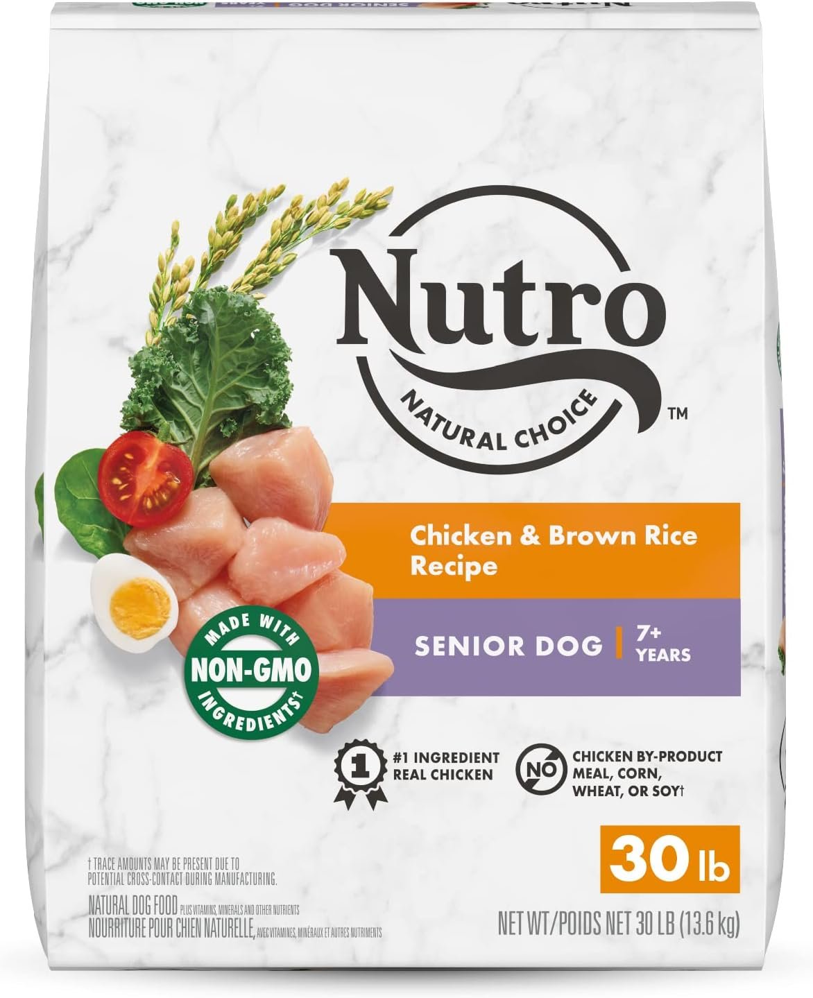 Contains one (1) 30 lb. bag of NUTRO NATURAL CHOICE Senior Dry Dog Food, Chicken & Brown Rice Recipe for senior dogs ages 7 and older; real chicken is the #1 ingredient