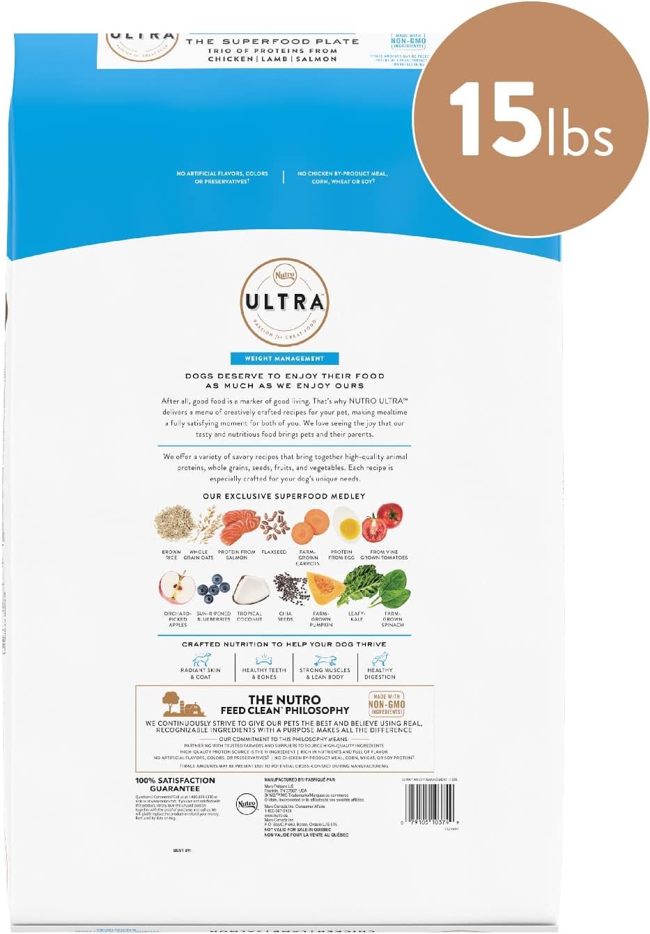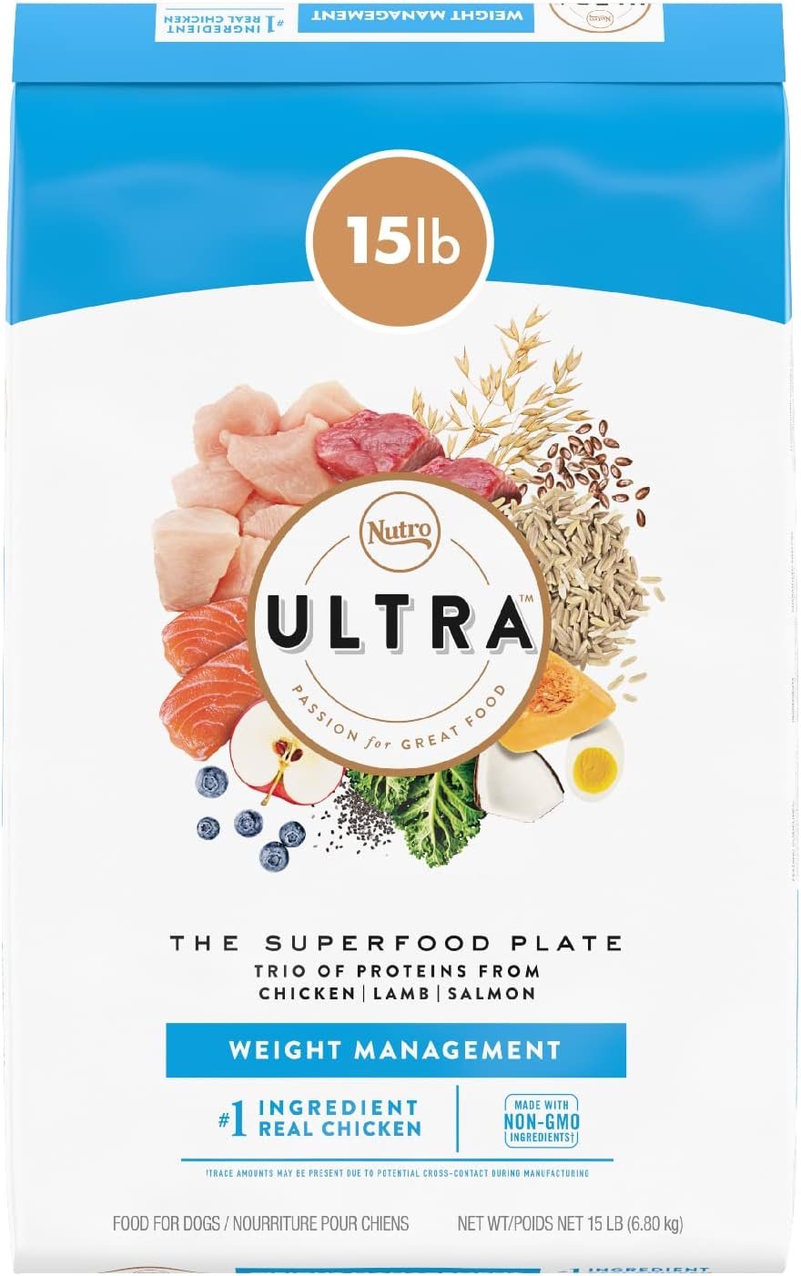 Contains one (1) 15 lb. bag of NUTRO ULTRA Adult Weight Management Dry Dog Food with a Trio of Proteins From Chicken, Lamb and Salmon