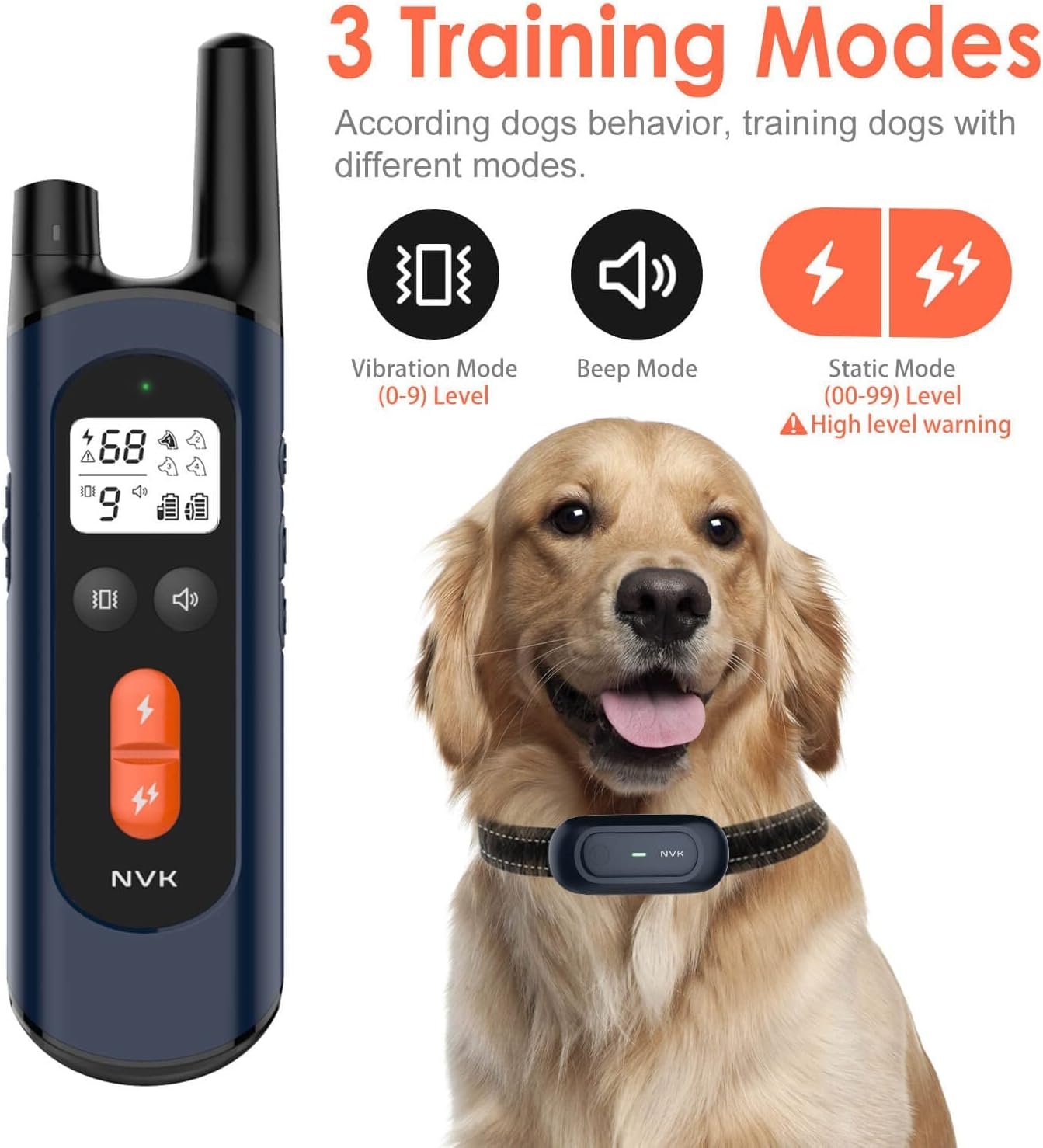 Dog Training Collar Modes: NVK shock collar with 3 training modes (Static Shock (0-99 levels), Vibration (1-9 levels), Beep).