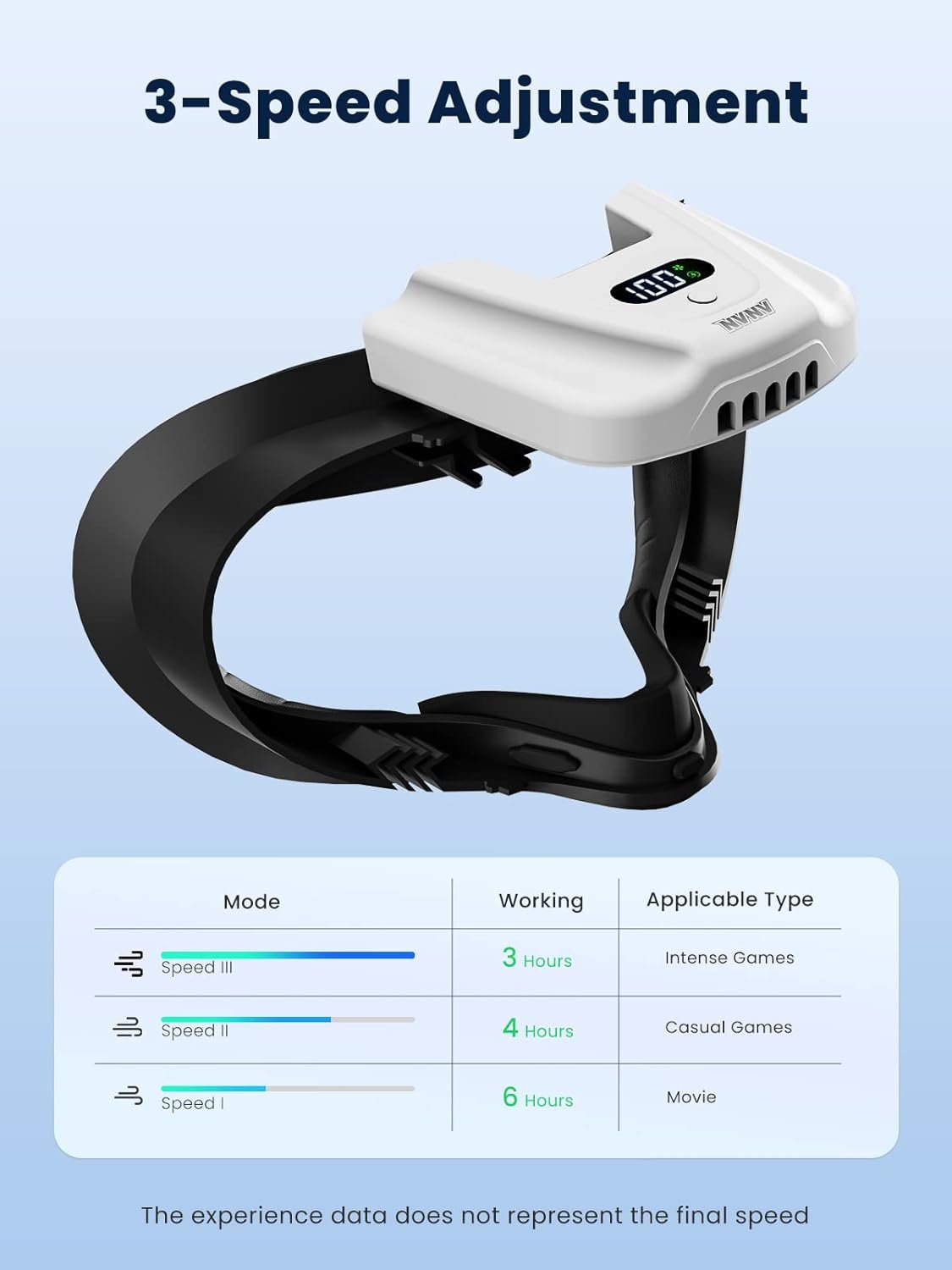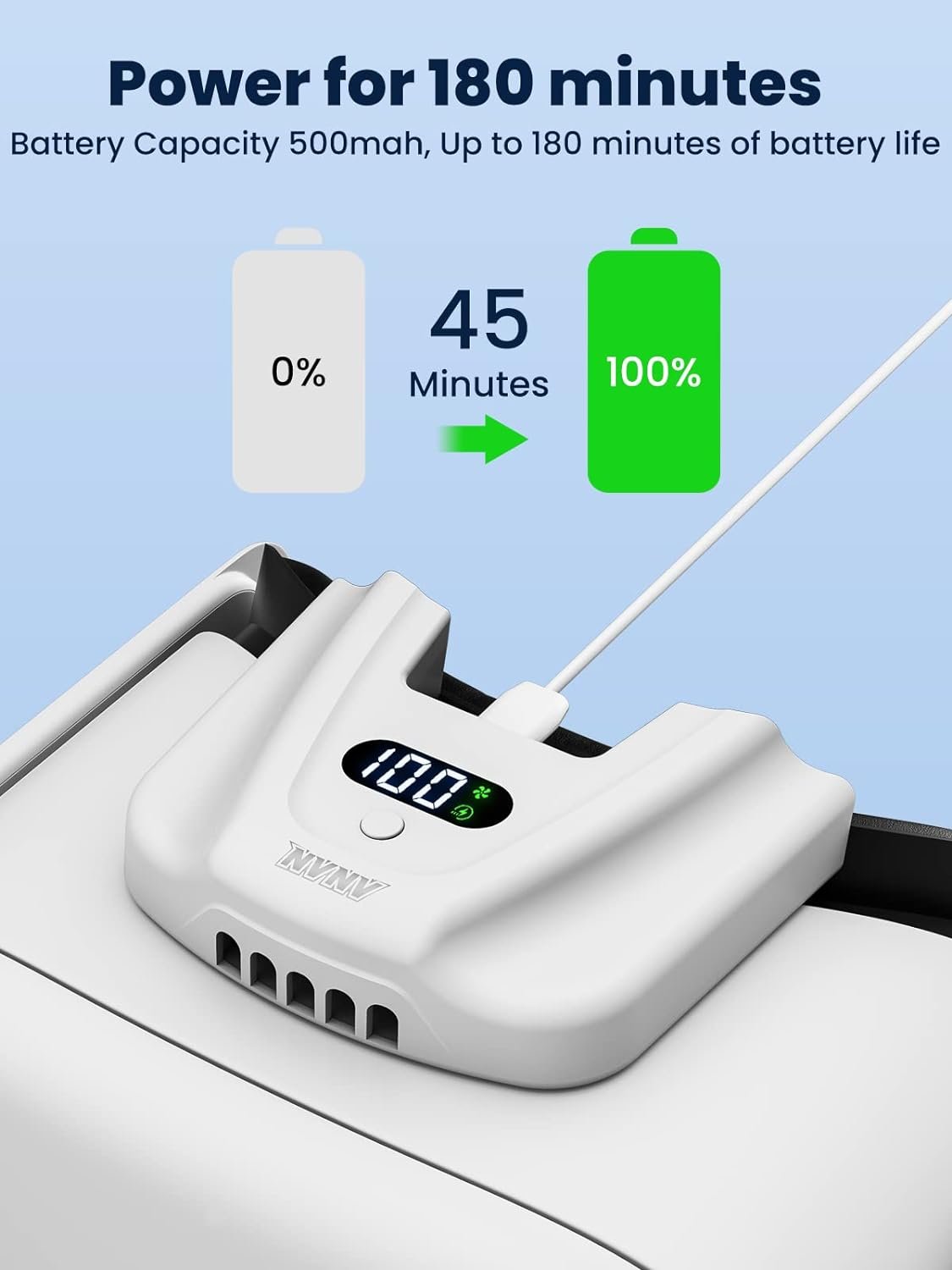 Adjustable wind speed: Different scene types use the right mode to get a longer battery life. Speed 1 mode is for movie watching, speed 2 mode is for normal games, and speed 3 mode is for fitness, workout and intense games. Equipped with 500 mAh battery and type C charging port, 0% to 100% in 45 minutes. A full charge lasts 3-6 hours