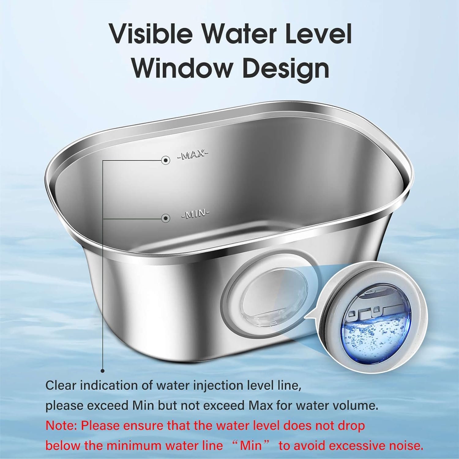 【Water Level Window 】Stainless steel cat water fountain with a transparent window, so you can easily monitor the water level without the need to open it. Made of premium 304 stainless steel, it can withstand high-temperature cleaning to keep your pet healthy. The main stainless steel parts is dishwasher-safe.