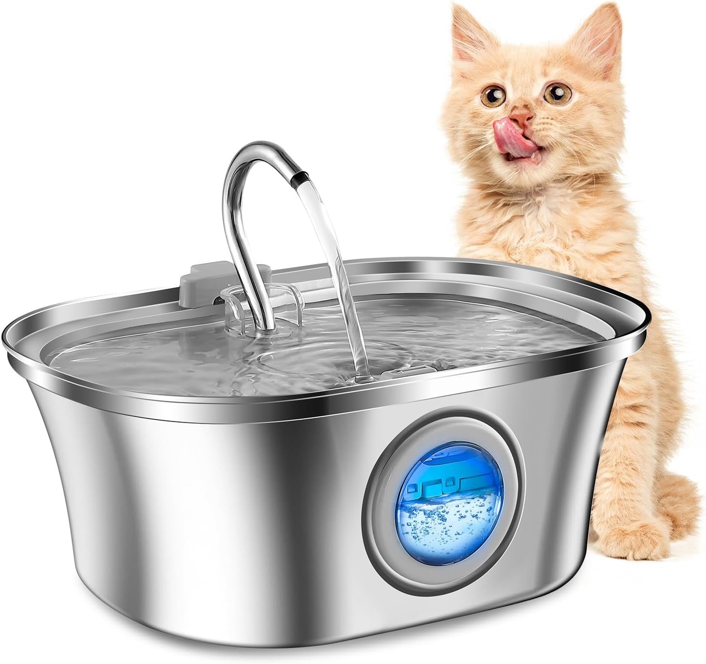 A2: A transparent round window is designed on the stainless steel cat water fountain, you can view the water level of the cat water fountain without opening the cat fountain. The cat fountain is made of high quality 304 stainless steel, which is corrosion resistant.