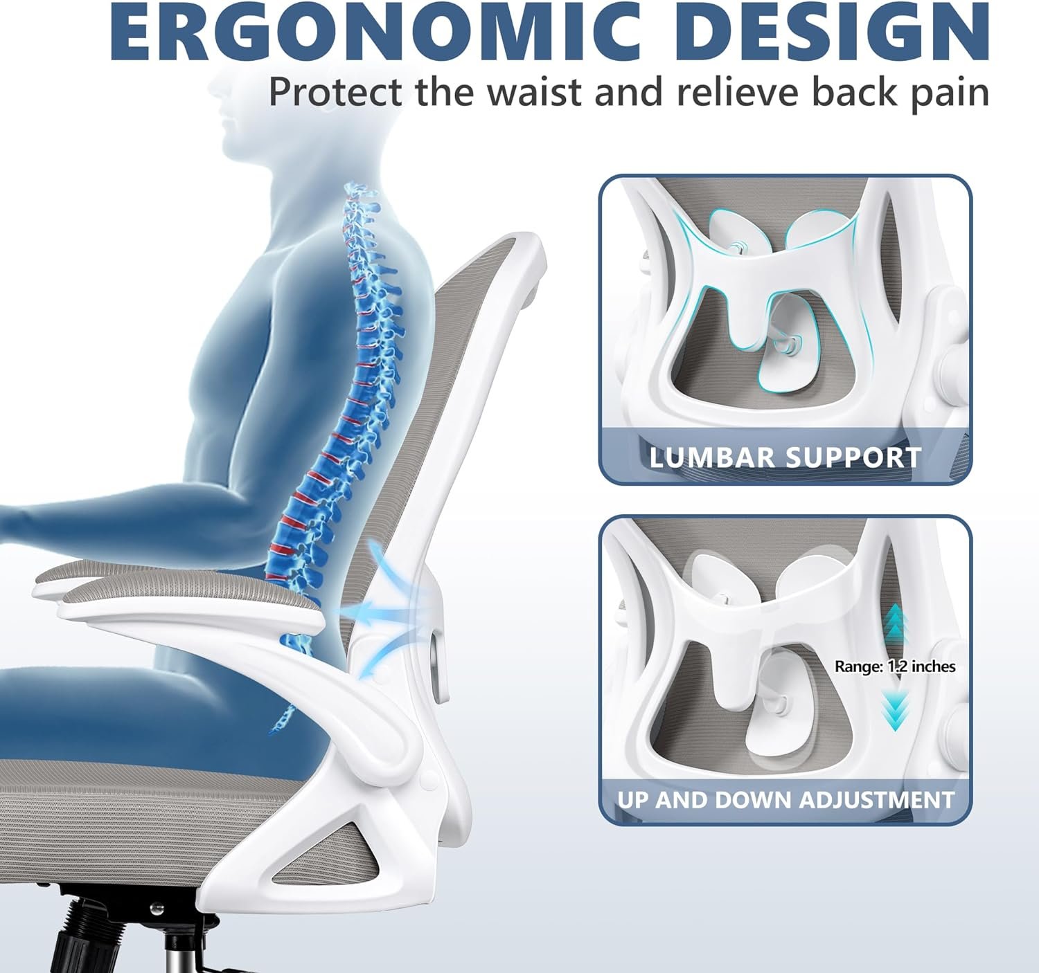 𝗘𝗿𝗴𝗼𝗻𝗼𝗺𝗶𝗰 𝗗𝗲𝘀𝗶𝗴𝗻: Ergonomic curved backrest, which perfectly fit to the curve of your back. The adjustable lumbar support of this home office desk chair is designed to protect your spine and relieve back and spinal pain during long hours of work. The unique Y-shaped bracket design improves the stability of the backrest.