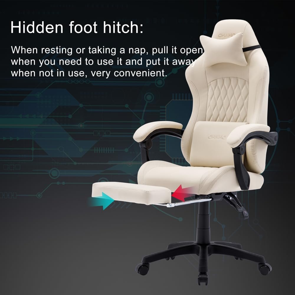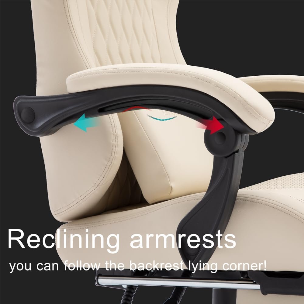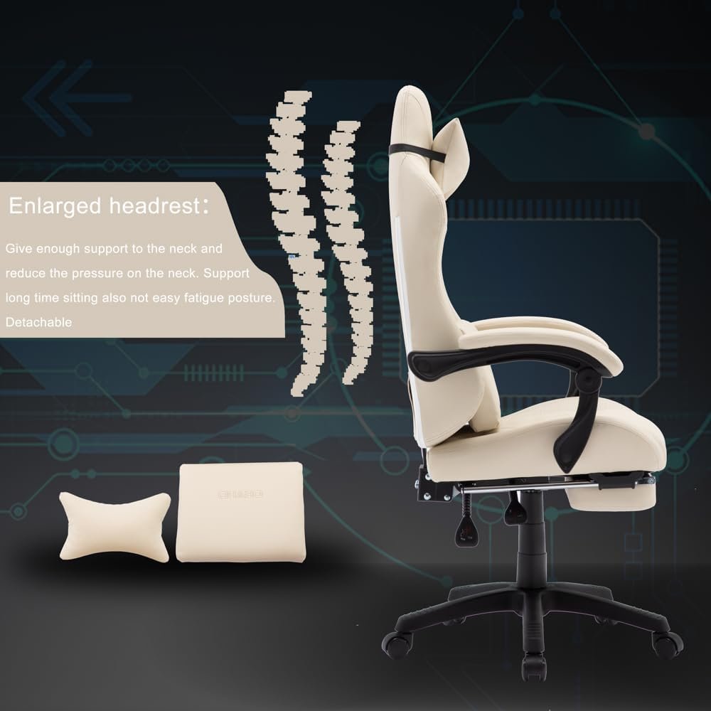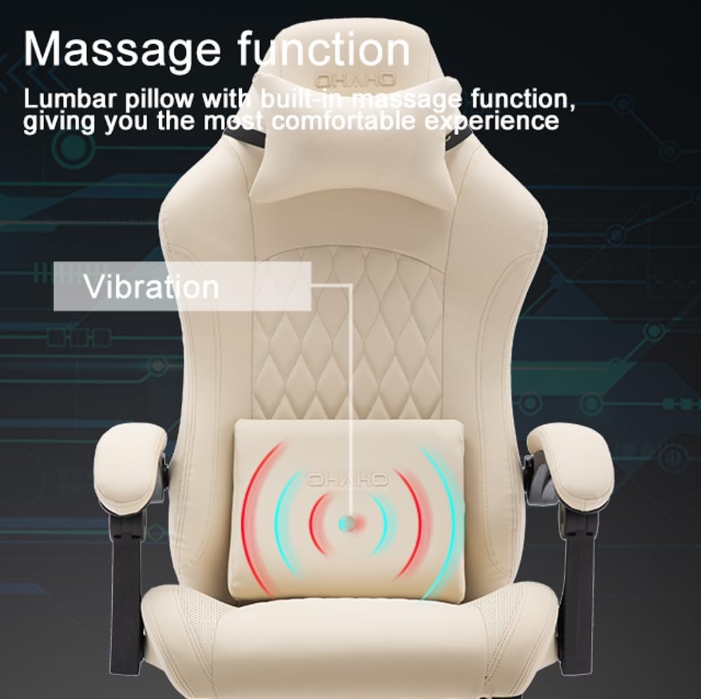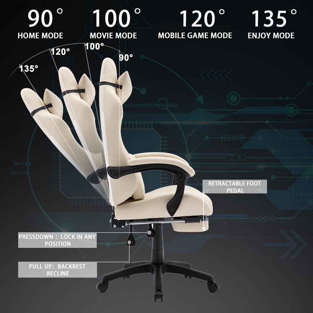 This chair has a multi-function backrest that can adjust from 90-135 degrees, a 360° swivel round base for easy movement, a retractable footrest for added relaxation, a removable headrest pillow for neck support, and a massage lumbar cushion for lower back comfort.
