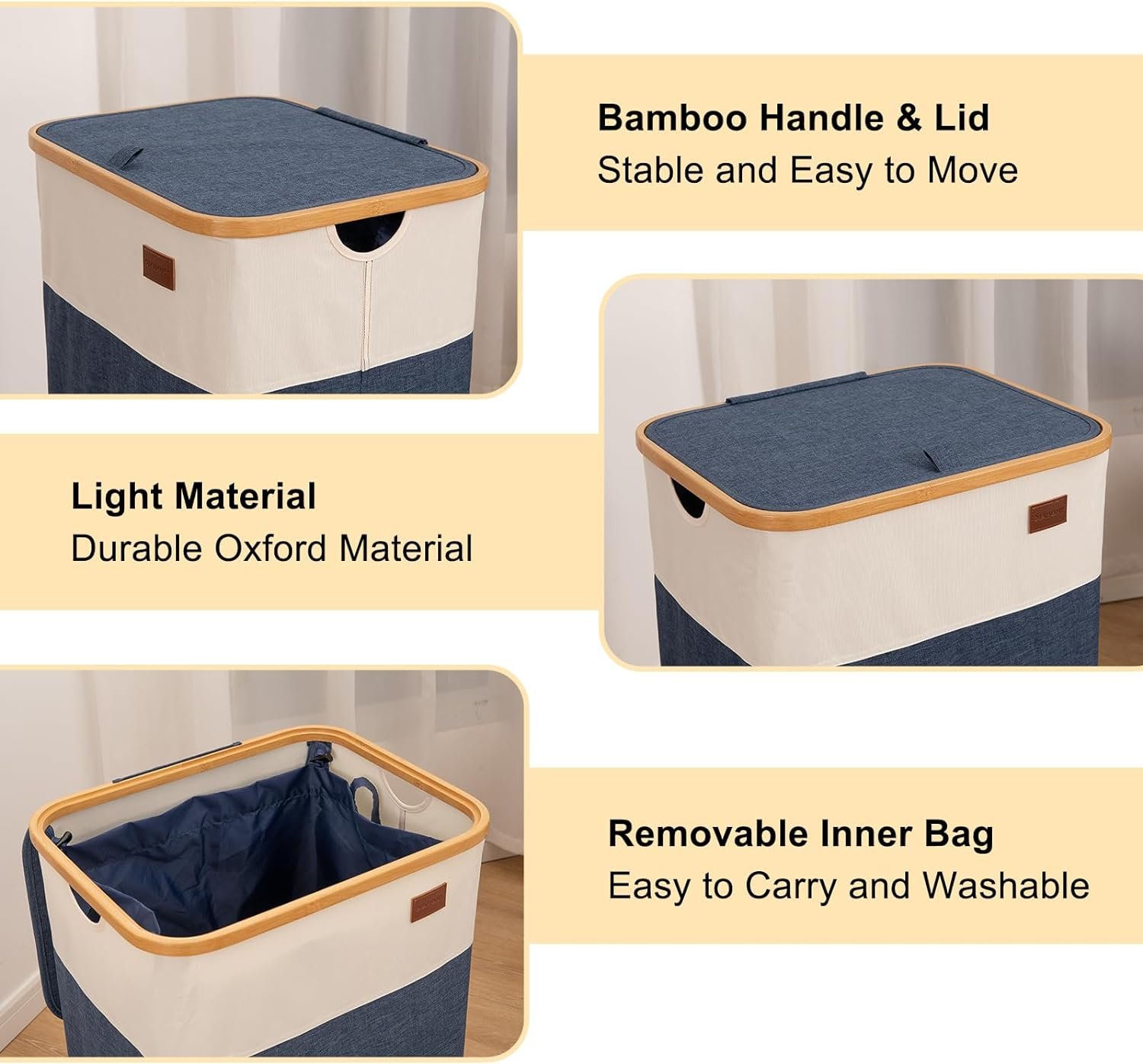 OIAHOMY Laundry Hamper With Lid, 100L Collapsible Laundry Basket With 2 Removable Inner Bags, Clothes Hamper With Bamboo Handles, Large Foldable Laundry Hamper, Dirty Clothes Hamper for Bedroom (Blue)