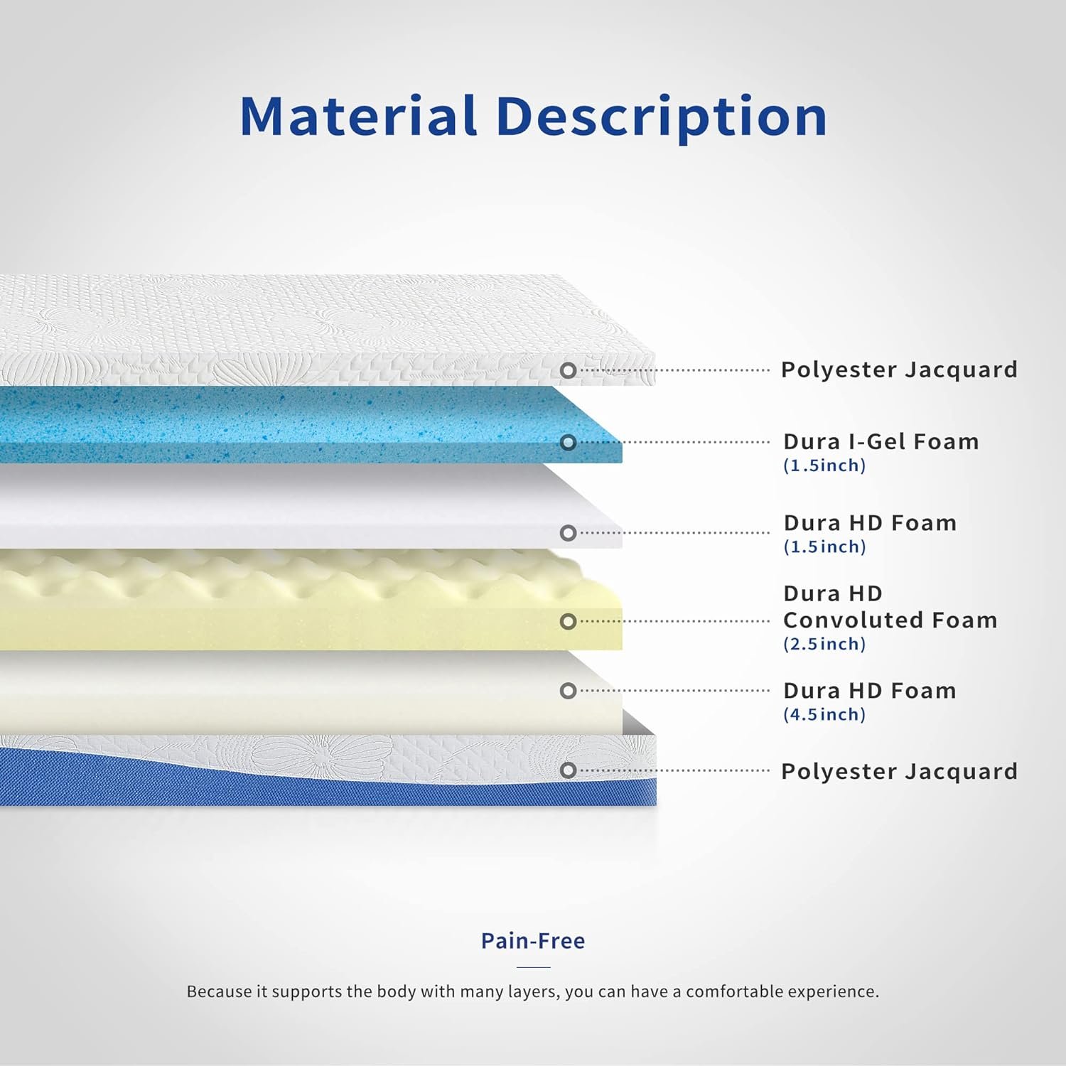 I gel infusion, ventilation memory foam mattress new gel materials that are breathable, help you sleep in proper temperature. Non temperature sensitive foam. Pressure-relief materials that adapts to your body shape, weight and temperature. I gel performance materials to lower temperature ventilation with convoluted had layer our foam is designed to improve its durability with an excellent breathability and resilience than compared to other ordinary memory foam. Our Mission is to provide the most reliable & innovative products that results in most satisfying sleep experience.