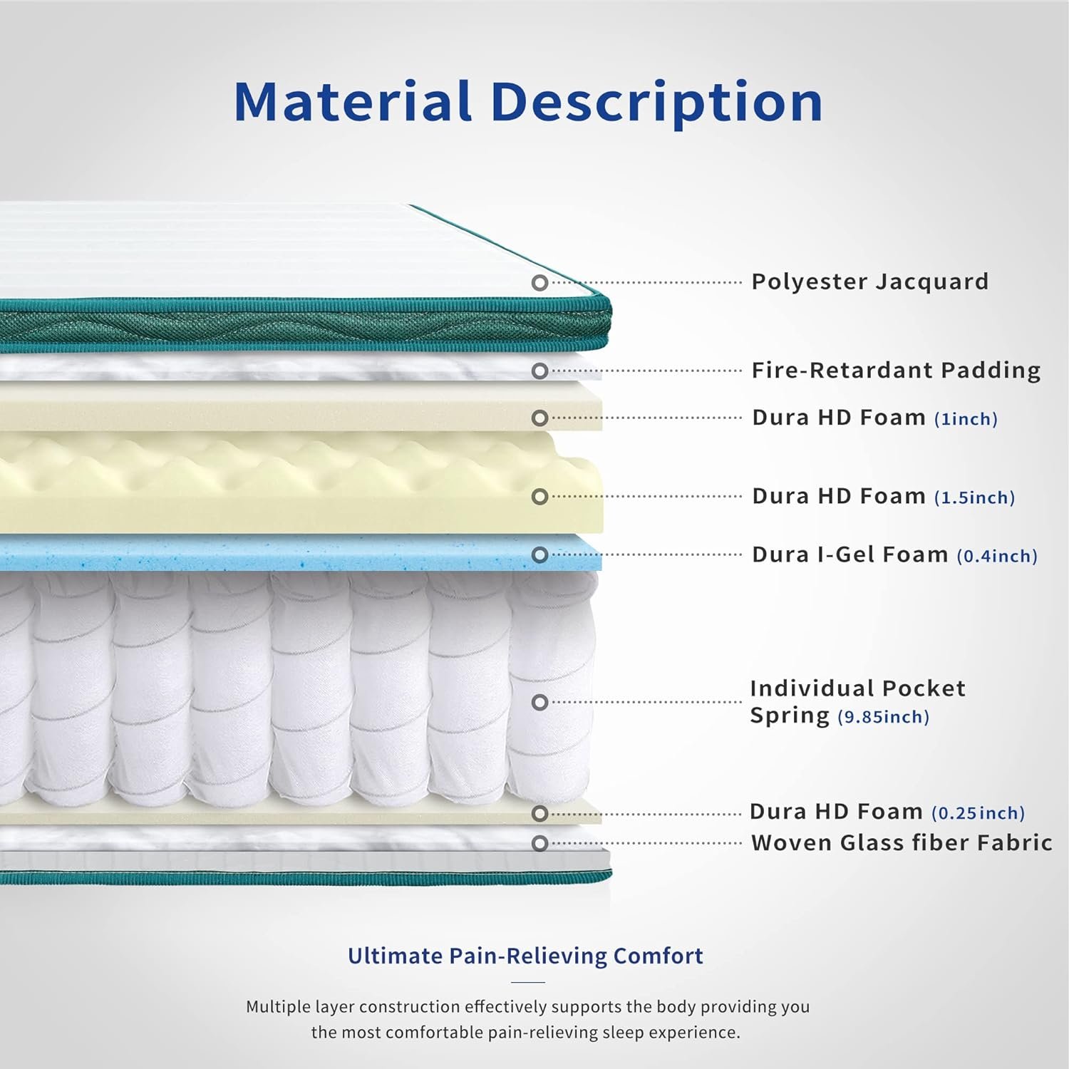 OleeSleep’s 13 Inch Dual Layered Gel Hybrid Memory Foam Mattress encompasses the comfort of memory foam, minimizes pressure on the body, and provides balanced support. Within minutes, it creates a perfectly personalized and balanced form around the body. OleeSleep uses Dura spring feature that contains low-gauge steel pocket coils to provide additional support, conformability, and comfort and supports body weight evenly, relieve pressure focused on the shoulders, hips, and feet, and eliminate motion disturbance. The result is a unique and unprecedented sleeping experience.