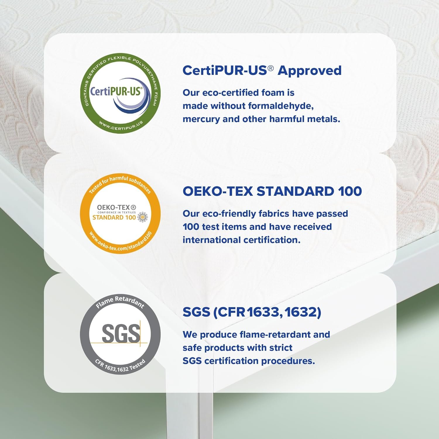 – CertiPUR-US: Certification of polyurethane foam for indoor emissions, product performance, physical durability, and environmental responsibility.