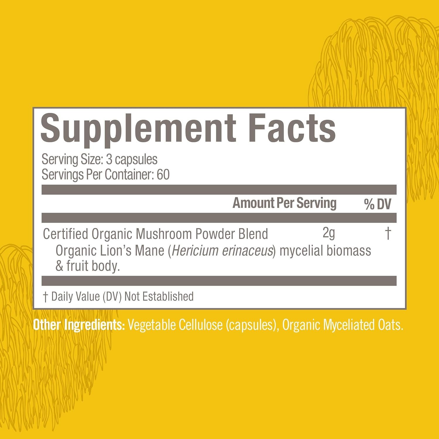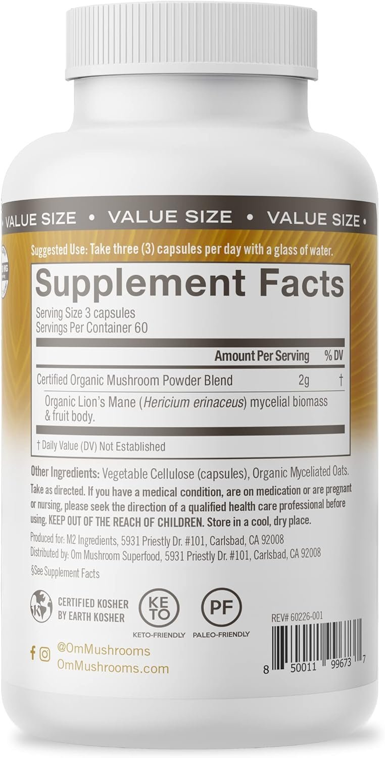 Om Mushroom Superfood Lion’s Mane Mushroom Powder Capsules: Contains one 180 ct. bottle (60 day supply) of Lion’s Mane mushroom powder superfood supplement capsules. Each serving provides an efficacious dose of 2000mg of functional mushrooms for Memory Support, Focus, Clarity, and Nerve Health Superfood Mushroom Supplement