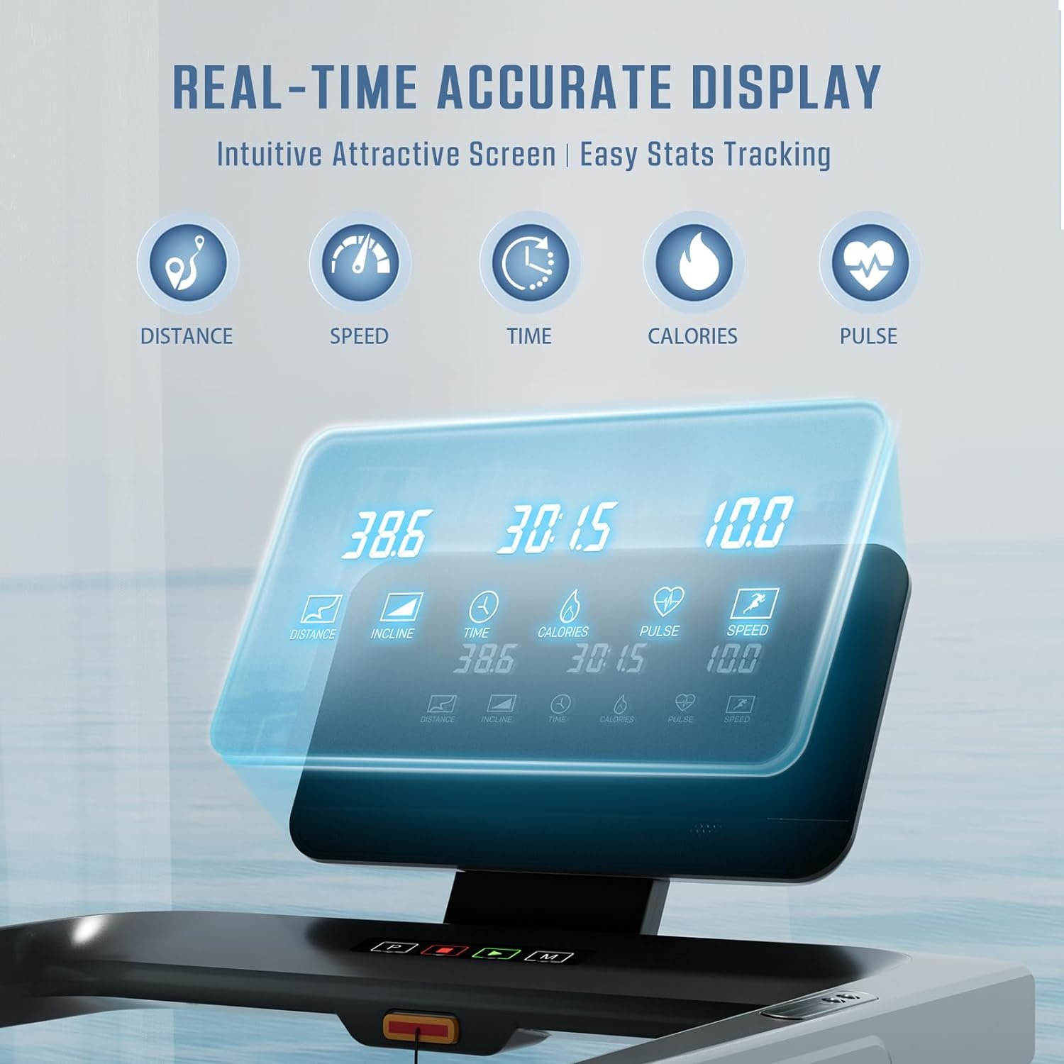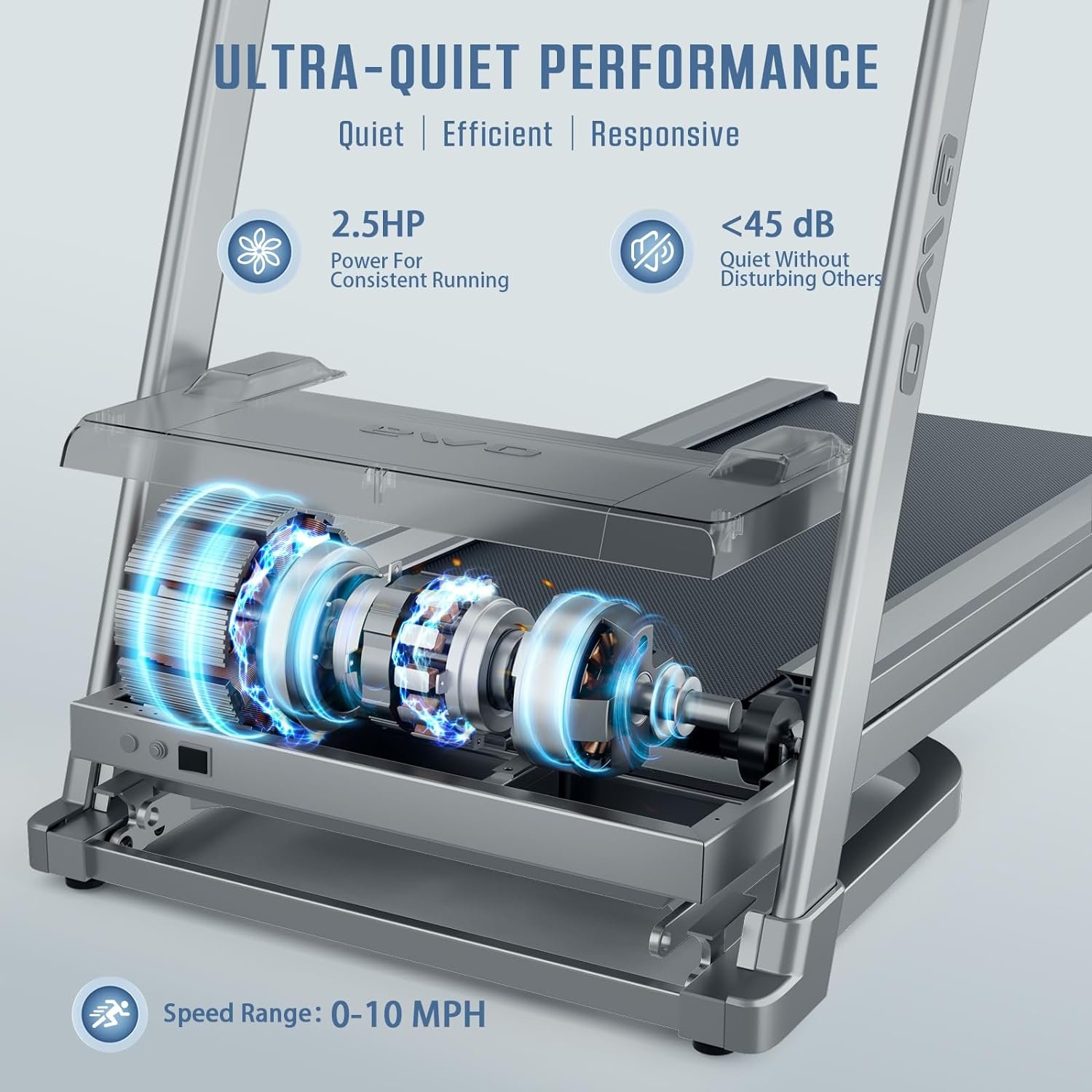 【Hyper-Quiet Performance】Develop with advanced technology drive system and super smooth operation, 2.5HP powerful motor controls the sound at lower than 45dB and provides speed up to 10 MPH. This treadmill allows you to walk or run without disturbing others or family.