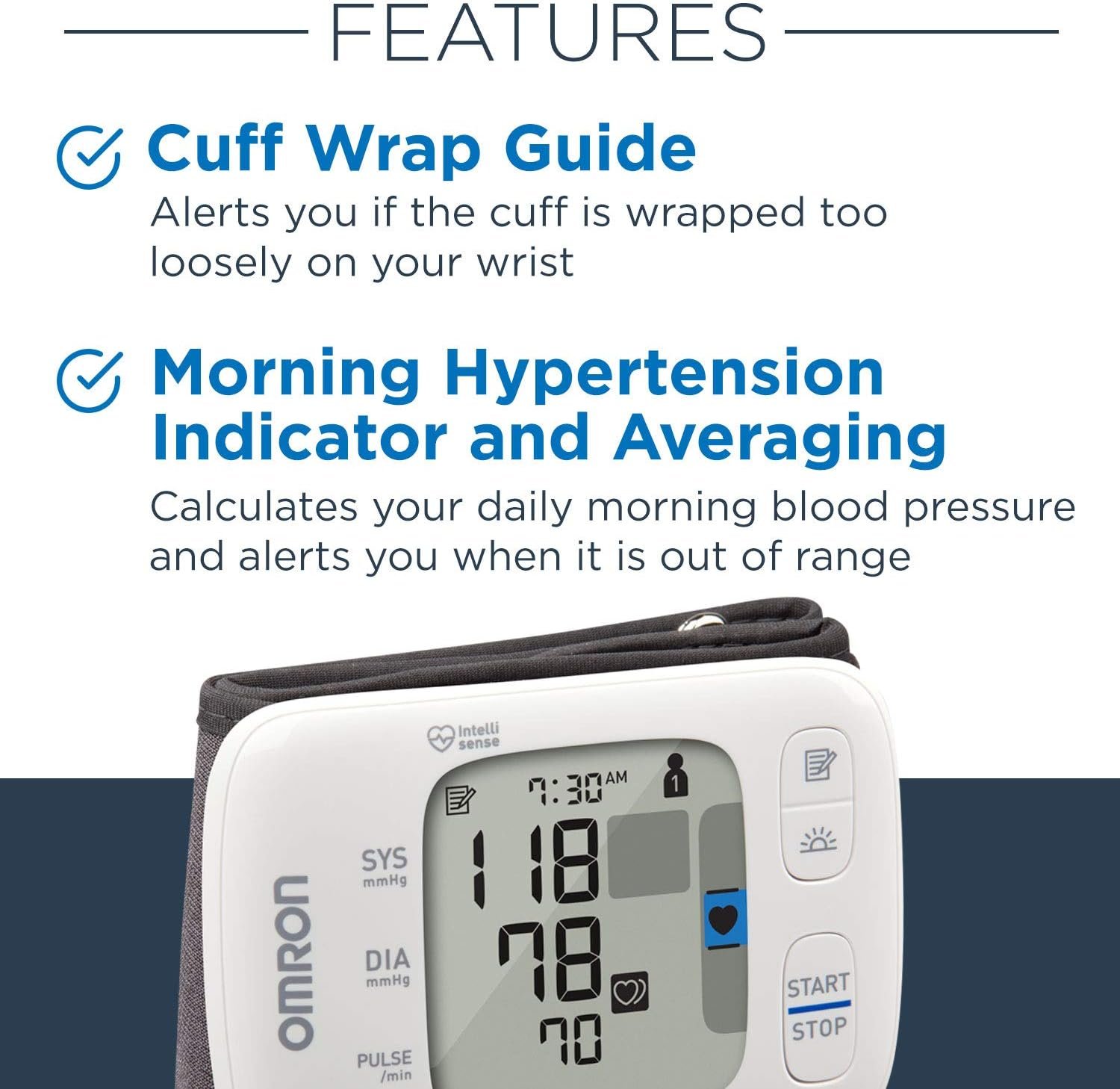 Product 1: The Gold wrist monitor comes with premium OMRON features like Heart Zone Guidance, which helps to guide your wrist to the proper position (at heart level). Ultra-Silent inflation feature allows for measurements to be taken quietly and discreetly.