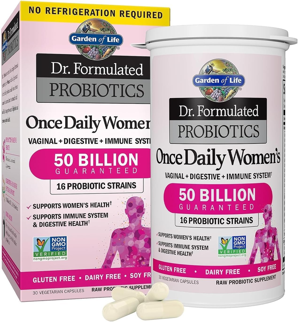 Garden of Life Once Daily Women’s Probiotic contains 50 Billion CFU of 16 probiotic strains, including L. reuteri and L. fermentum to help maintain vaginal health and overall women’s health.