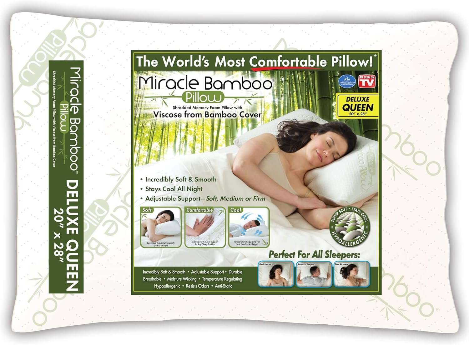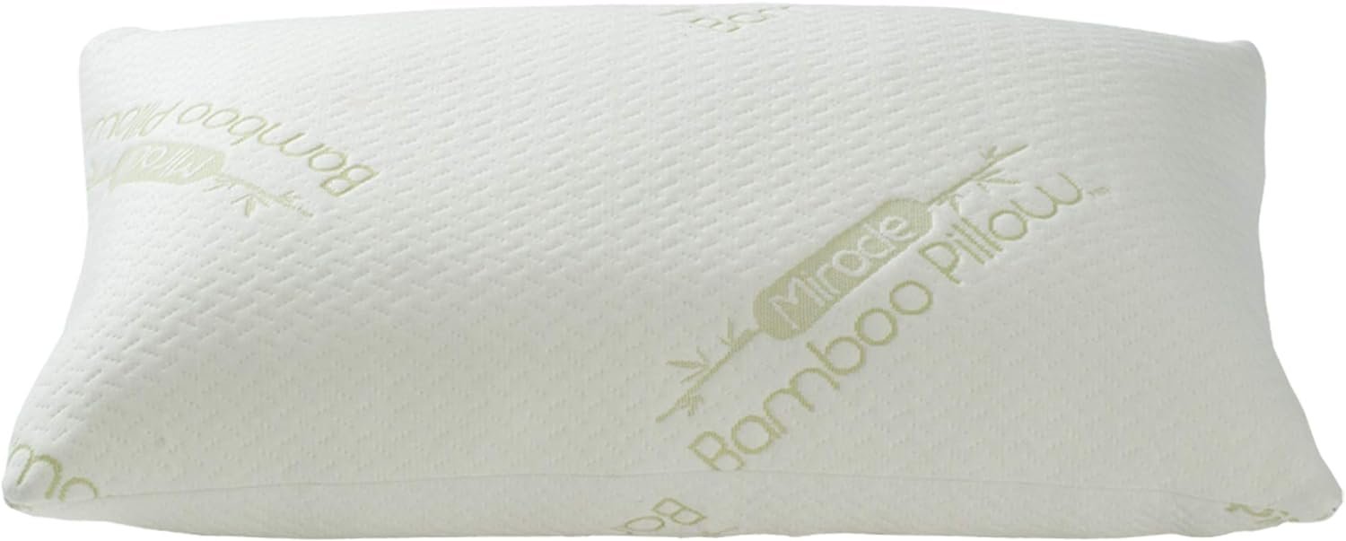 Introducing the Miracle Bamboo Pillow for a better rest. The special blend of shredded memory foam, cast inside a luxurious cover made from a revolutionary new bamboo fabric, provides an ultra soft design that is sure to give you a restful and cozy nights sleep. The bamboo fabric wicks away moisture, while regulating temperature, staying cool and fresh. Memory foam forms to your body to perfectly cradle your head, neck, and shoulders for maximum relaxation. No more flipping or rearranging your pillow throughout the night. Never goes flat, always comes back! 28″L x 20″W.