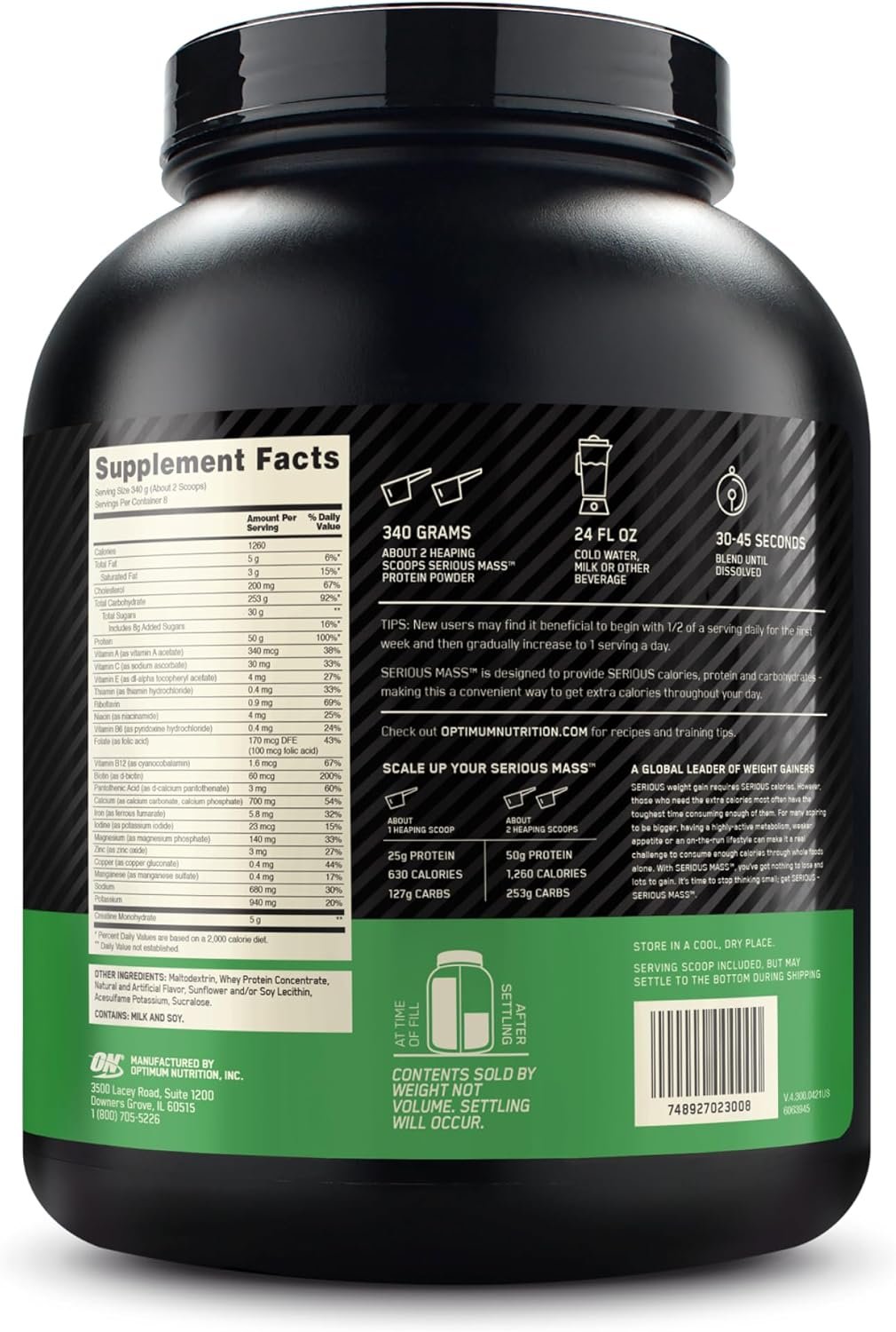 More calories. More protein. More carbs. SERIOUS MASS by Optimum Nutrition serves up 1,260 calories, 50g of blended protein, and over 250g of carbohydrates per serving to help you maximize your daily caloric intake – the ideal post-workout and between meals shake for sizing up your goals. SERIOUS MASS provides you with more tools to help you pack on pounds, when taken in addition to normal calorie intake and over time with regular resistance training. Calories per gram: Fat 9, Carbohydrate 4, Protein 4.
