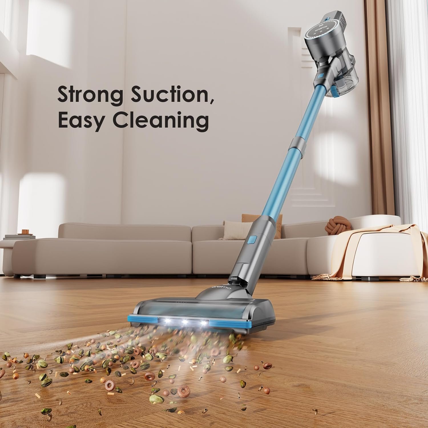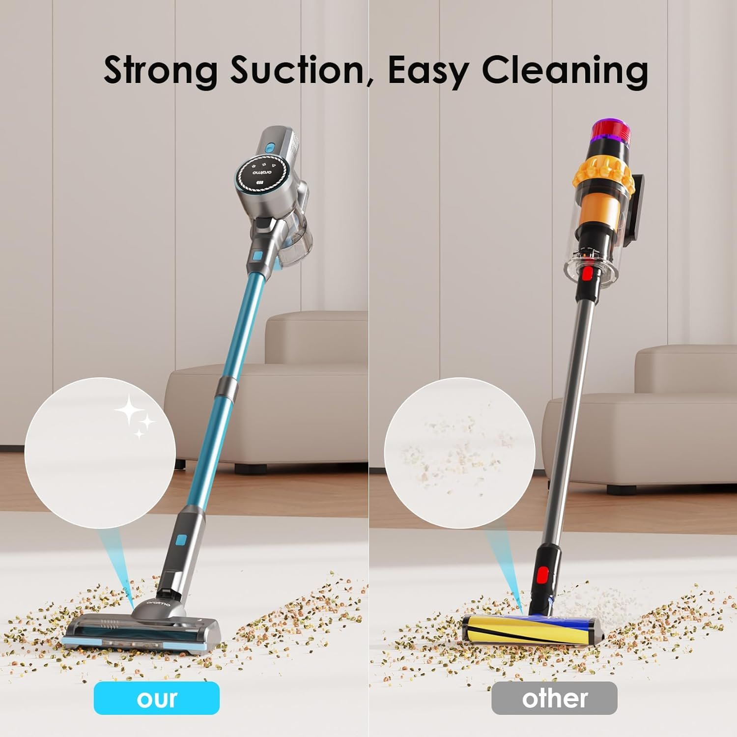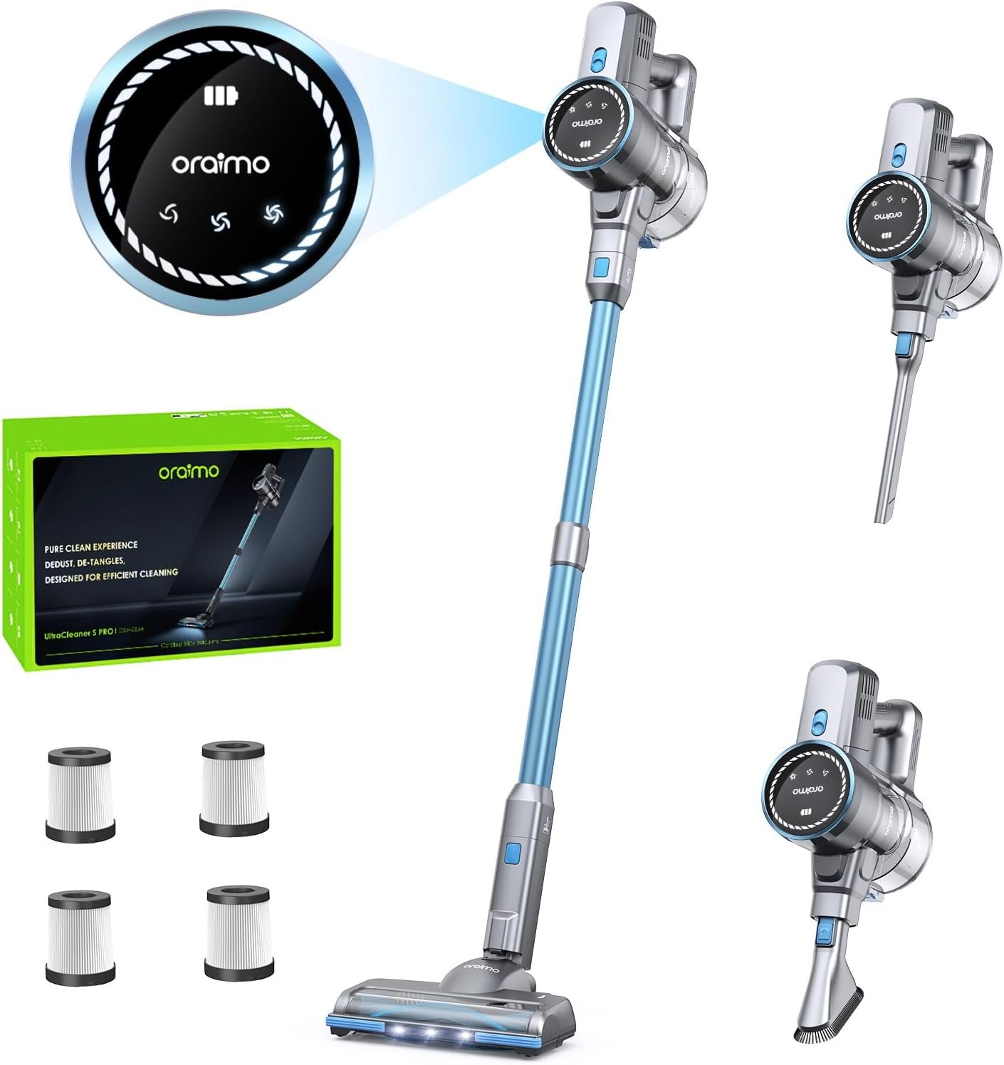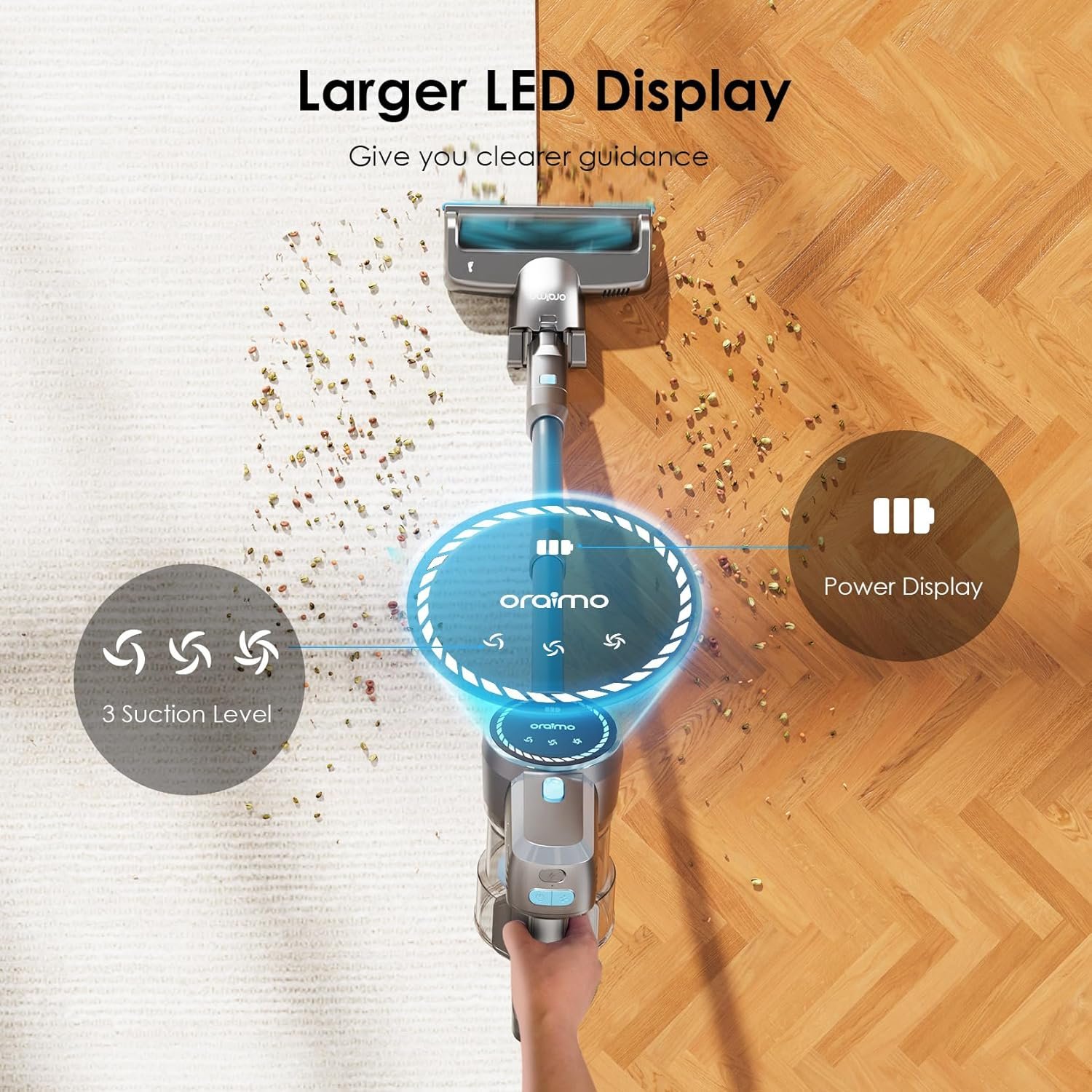 【Up to 24kpa Suction】With upgraded 270W brushless motor, Oraimo cordless vacuum cleaner provides up to 24kpa strong suction, effortlessly remove dirt, debris, dust, pet hair, and stubborn dirt, leaving no residue after vacuuming.