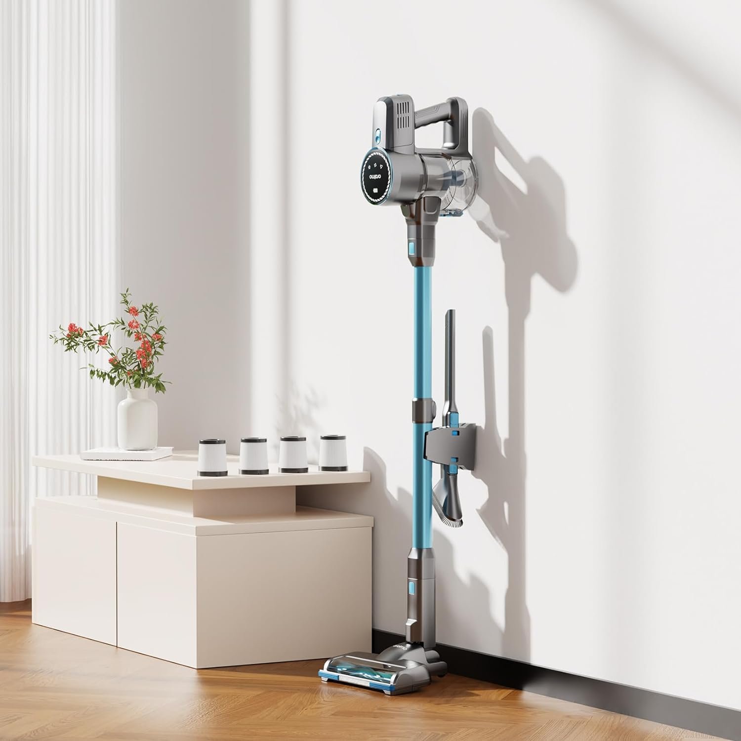 【Thoughtful Design】Oraimo cordless stick vacuum is self-standing, easy for storage. Also, it comes with 4 HEPA, (enough for 1-year use), which can capture 99.99% particles, and reduce second-hand pollution by releasing clean air.
