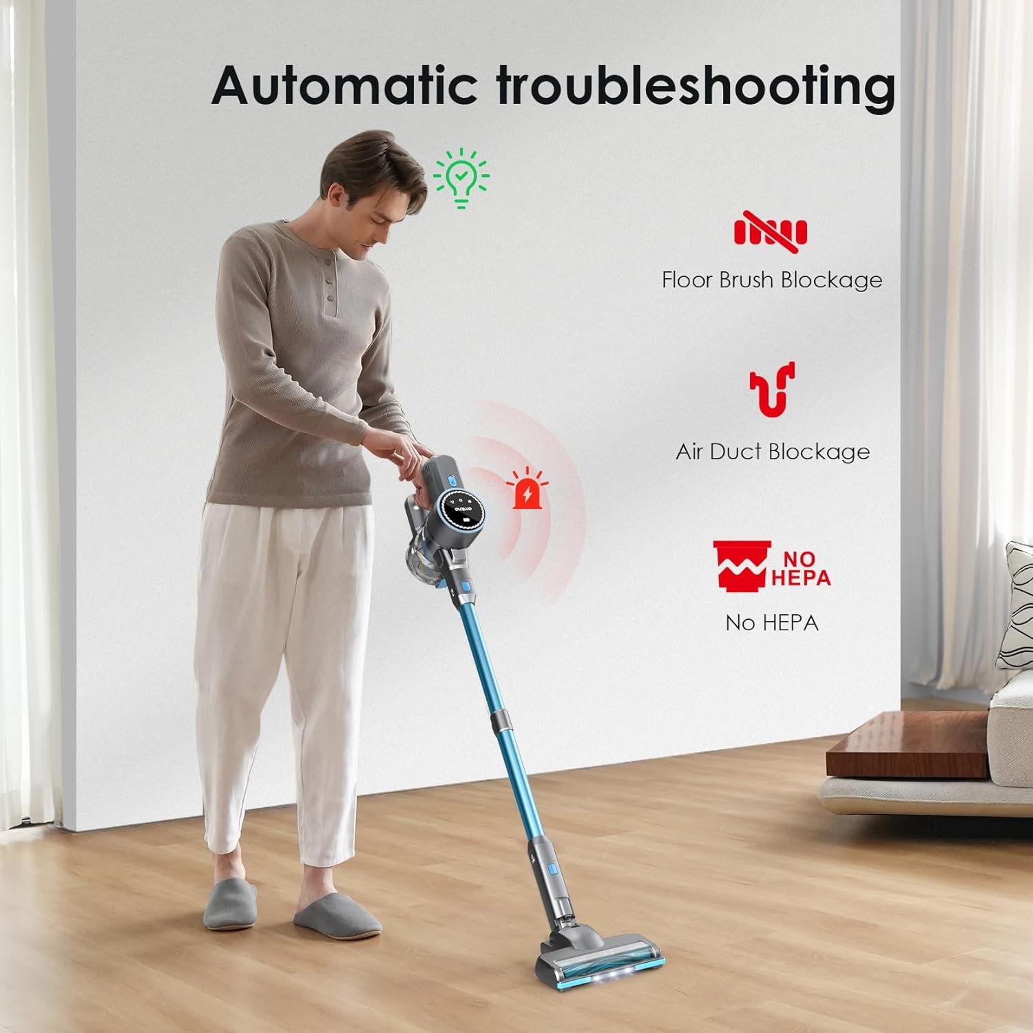 【Larger LED Display】This vacuum cleaner for home features a large LED display panel, shows you the suction level and battery power. It also alerts you when the floor brush or air duct is blocked, or no installation of HEPA(Very important, it will affect the life of motor).