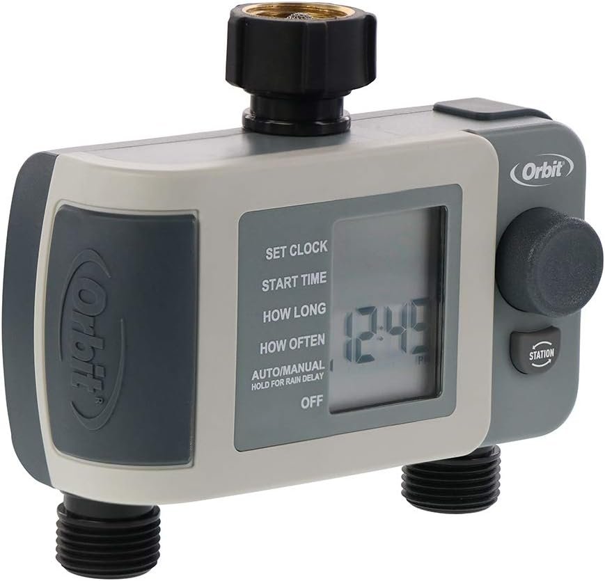 The Orbit 2-Outlet Hose Faucet Timer will turn your hose faucet into a programmed sprinkler system in minutes. No more dead plants because you forgot to water them. No more soggy lawns and wasted water because you forgot to turn off the sprinklers. Just set the timer and go! With a large digital display and simple controls, programming is fast and easy. This timer features simple, easy installation and programming. There is no need for tools. Just set the start time, watering duration and frequency. A manual button allows instant faucet use without interrupting your set program. The built-in rain delay pauses your programmed schedule for 1-7 days. Programmed on/off times save water and are perfect for drought and non-drought conditions. Built with high-quality materials and water-resistant construction, you can count on many years of dependable use.