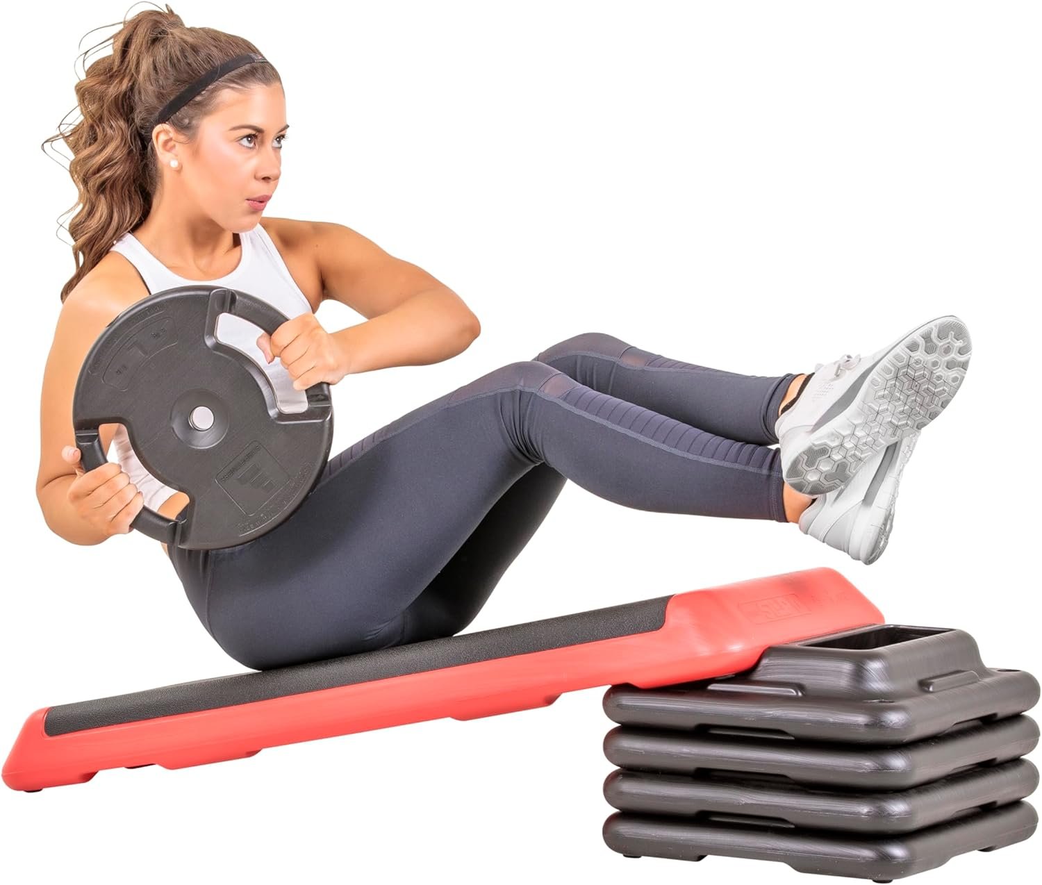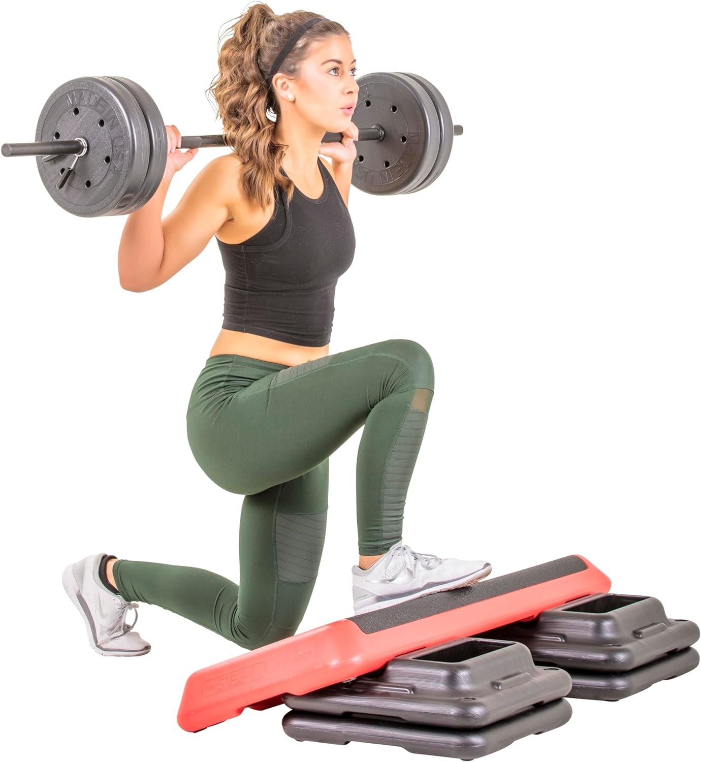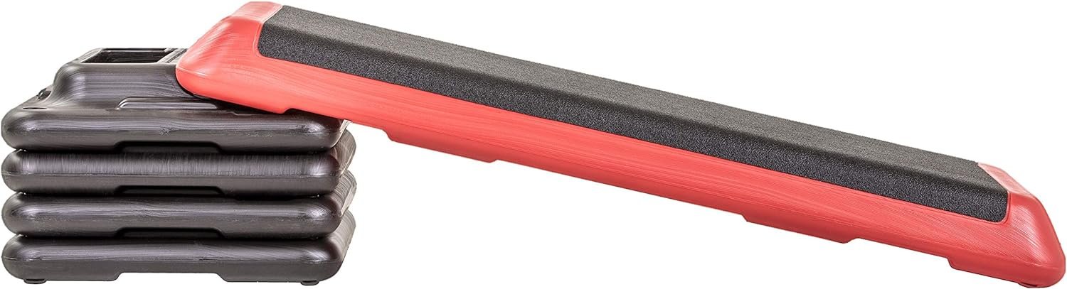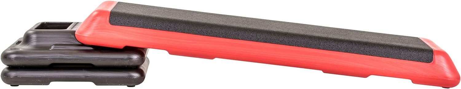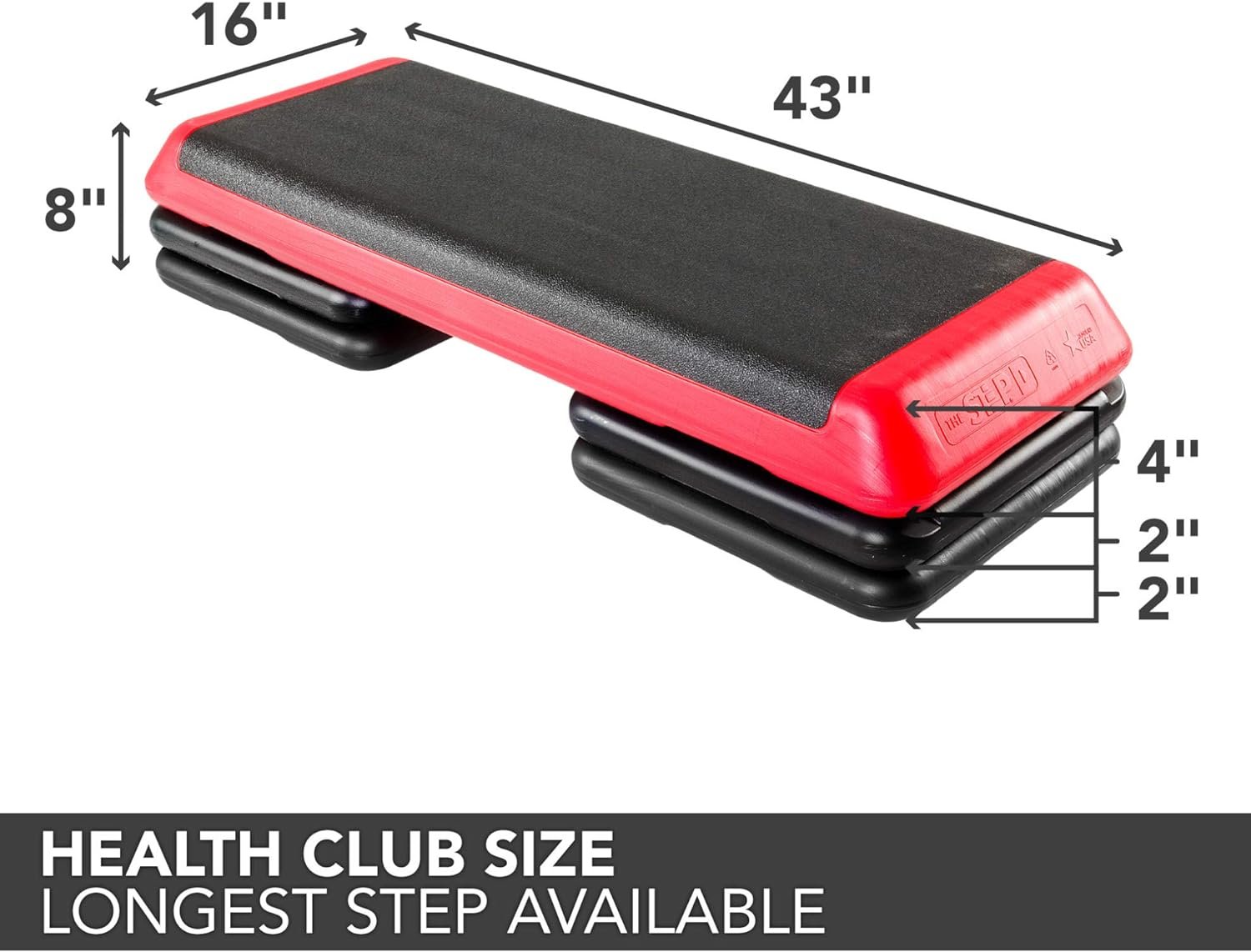 Achieve total-body fitness with The Step Club Size Aerobic Platform, the same step used in fitness clubs across the country. The Step is a great home-fitness tool for beginners to experts and is customizable for a variety of aerobic and strength exercises. This set includes a grey nonslip platform, 2 patented freestyle risers and 2 original risers to create the foundation of any workout program. The Club Size platform features one (1) stepping surface (43″ L x 16″ W x 4″ H) and four (4) risers (16″ L x 16″ W x 2″ H). These sturdy risers can be used on any type of indoor flooring from carpet to concrete to hardwood without leaving behind scratches. The patented freestyle risers add variety to your workout with multiple slanted positions perfect for adding intensity to push-ups, sit-ups, lunges, and more. Burn more calories the higher you step with 4″ to 6″ to 8″ platform height options using the risers. Each riser and platform is made with four nonskid feet to prevent sliding or moving during exercise. Both the platform and rises also feature a resistance band notch, which safely holds an optional resistance band in place.