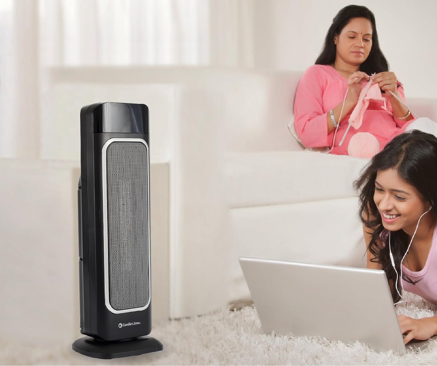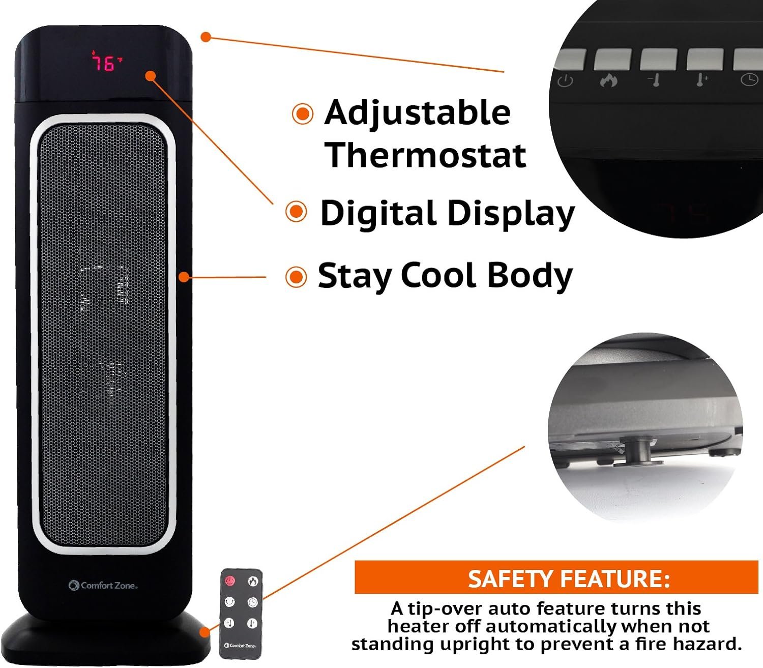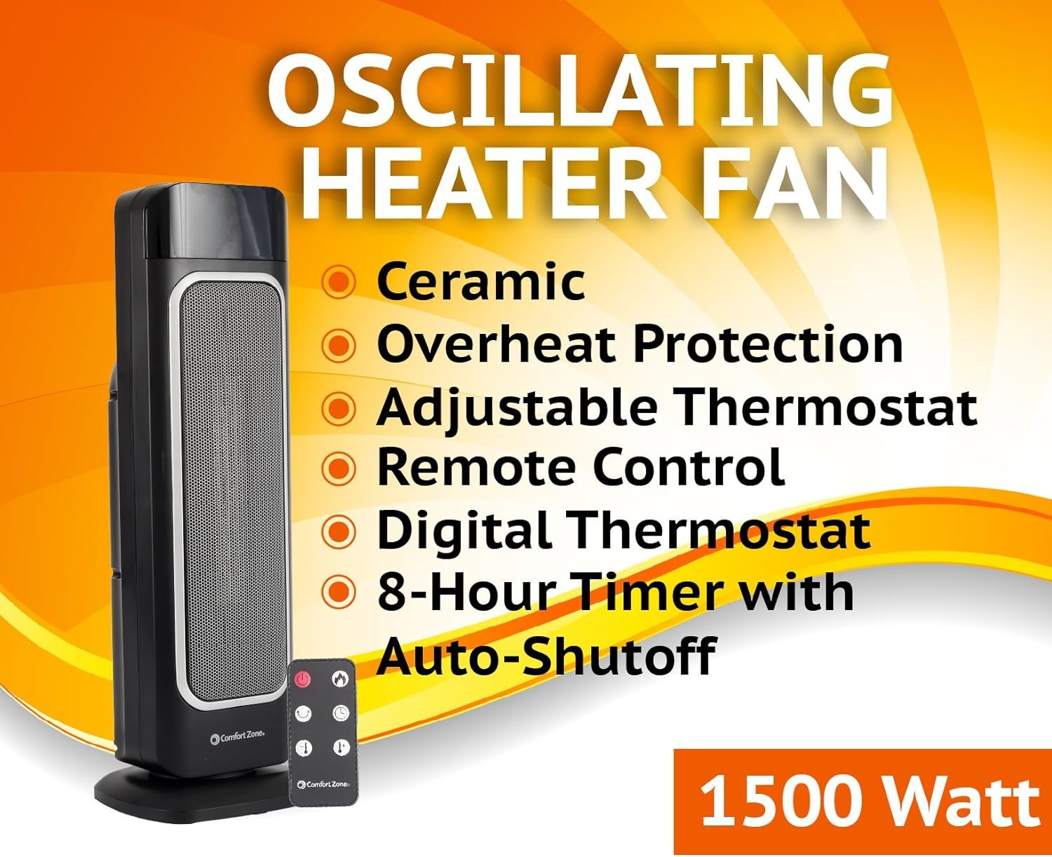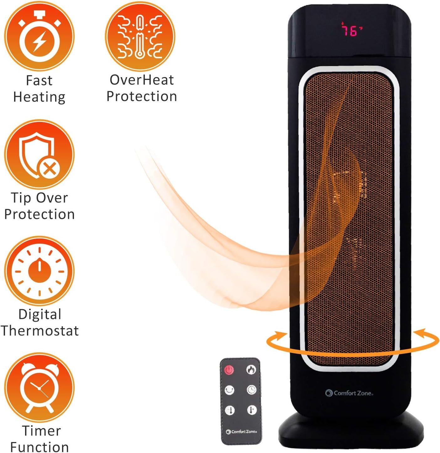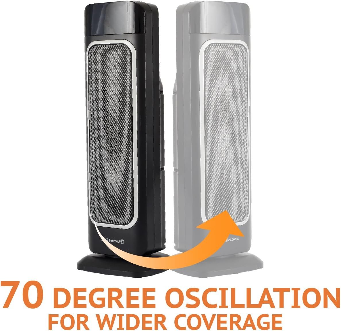 Fast, efficient, toasty warm technology few sensations are as soothing as stepping out of the cold into a warm, toasty room. With comfort zone’s oscillating heater fan, you can heat up any room quickly, evenly & safely while keeping energy costs To a minimum. Product features: fan forced whole room heating> digital thermostat 8-hour timer with auto-shutoff large room temperature display> eco mode adjusts heat output to lower costs stay cool housing> lightweight & portable> ETL certified> tip-over cut off switch> 23” x 8”even heating for optimal comfort this fan-forced heater rotates from side to side instead of blowing in only 1 area as panel heaters do, distributing heat throughout the room at a faster speed. Adjust the temperature as desired with our remote control & easily view on our large display. Set Our 8-hour timer with auto-shutoff for maximally economical use. This feature is ideal for bedrooms that are only used for sleeping at night or warming up the office during winter workdays. Lightweight & portable, this oscillating heater fan is easy to move from room to room of the house throughout the day, or even from your home to the workplace and back! And with all the money you’ll safe on heating bills, you might be tempted to purchase several! tall & Slim, It uses little floor space while making a large impact in comfort. While the oscillating heater fan is on, its digital thermostat maintains an optimal temperature for comfort, while the eco mode adjusts heat output for lower costs. Advanced safety system this unit is designed to be safe and efficient. The stay cool housing helps prevent burns In cases of direct skin contact and the digital thermostat prevents overheating. Additionally, it comes with a built in cutoff switch in the event the unit is accidentally tipped over, because at Comfort Zone your safety & comfort are our top priority.