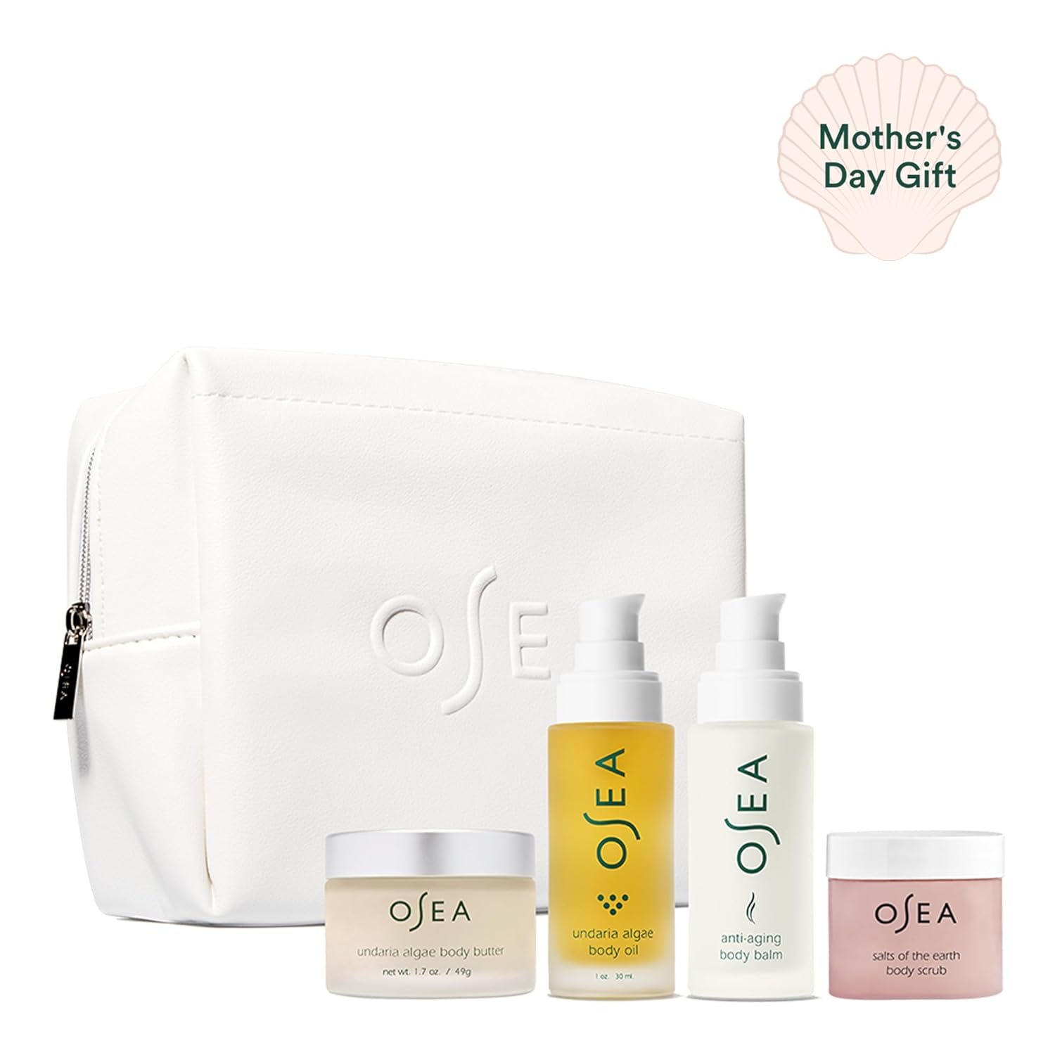 Undaria Algae Body Oil (1 oz): Rich seaweed-infused body oil for glowing, moisturized skin. – Anti-Aging Body Balm (1 oz): Nourishing formula enhances elasticity and suppleness. – Salts of the Earth Body Scrub (1 oz): Softens and buffs for unparalleled smoothness. – Undaria Algae Body Butter (1.7 oz): Age-defying, deeply nourishing body butter with a Vegan Leather Bag for travel or gifting.