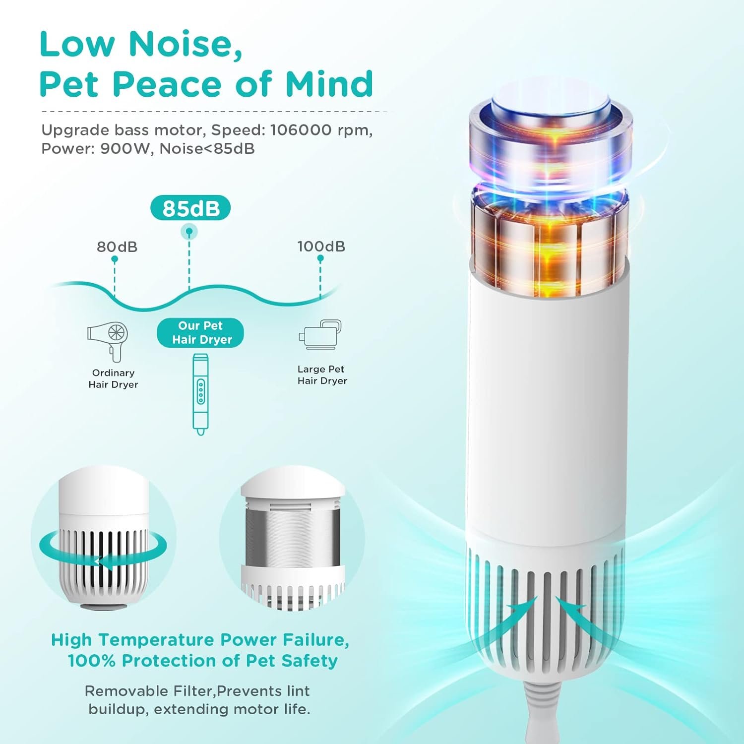 LESS NOISE & PET FRIENDLY:The silent motor of this quiet dog blow dryer produces less then 80dB of noise,which is 10-15 decibels lower than similar products when used,making the drying process more comfortable and enjoyable for your furry friend. Strong and stable motor equips this dog blow dryer with several speed and temperature levels. this dog hair dryer Maximum power: 1000 watts;Maximum Wind Speed: 25m/s; Temperature Range: 90℉-175℉. the motor saves energy with a power consumption of 400W.
