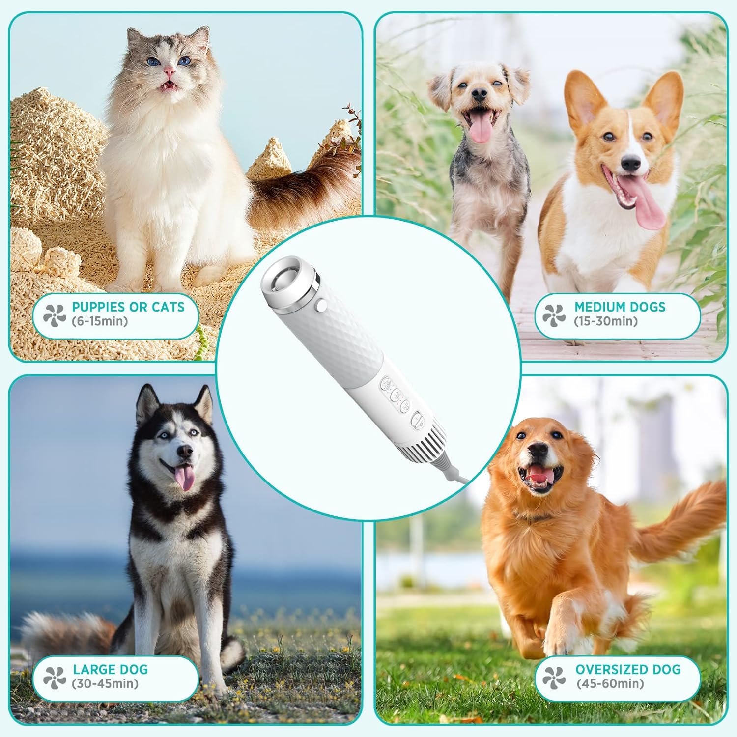 PORTABLE & TRAVEL-FRIENDLY:This dog dryer is compact, weighing only 20 ounces,4-in-1 pet blow dryer is equipped with 4 different nozzles to meet different drying needs for different pets.After a bath, rainy walk, or when traveling Easily store in backpacks and suitcases.Pet dryer is versatile and suitable for small and medium dogs and cats, making it an excellent investment for pet owners with multiple pets.