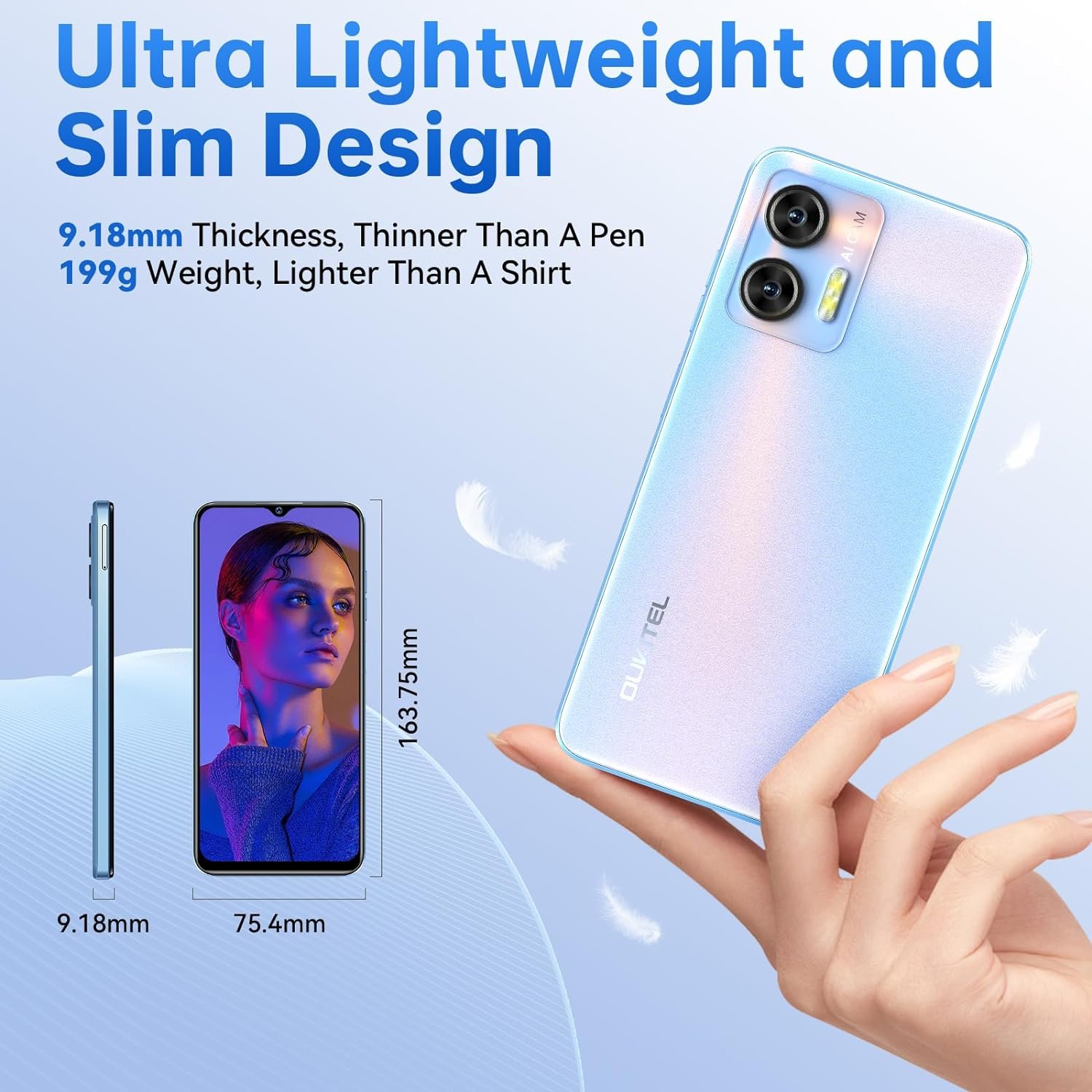 【Lightweight and stylish design with a comfortable grip】OUKITEL C36 android phone features a lightweight and sleek design that ensures a standout look and comfortable grip. It is only 9.18mm thickness, Thinner Than A Pen and weighs only 0.43lbs, Lighter Than A Shirt.