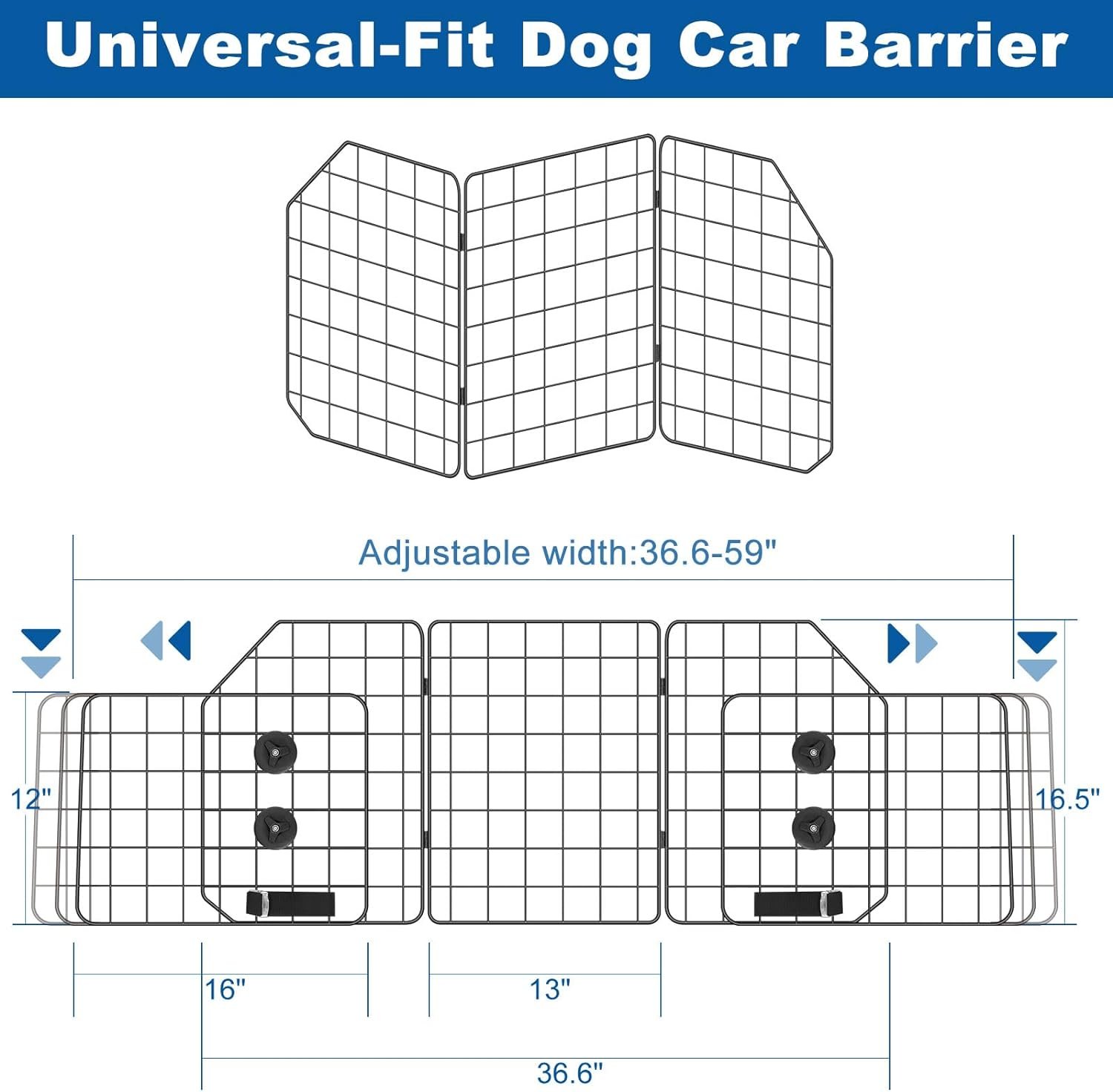 【Adjustable Universal-Fit Large Size】 The maximum extendable of dog fence barrier size up to 59″, Easily adjust to fit most SUV, Trucks, Hatchbacks and Vehicles. The measure size of 1x Main Panel is Length 36.6″ and Height 16.5″, 2x side panels is Length 16″ and Height 12″. Please see the third and fourth pictures for details.