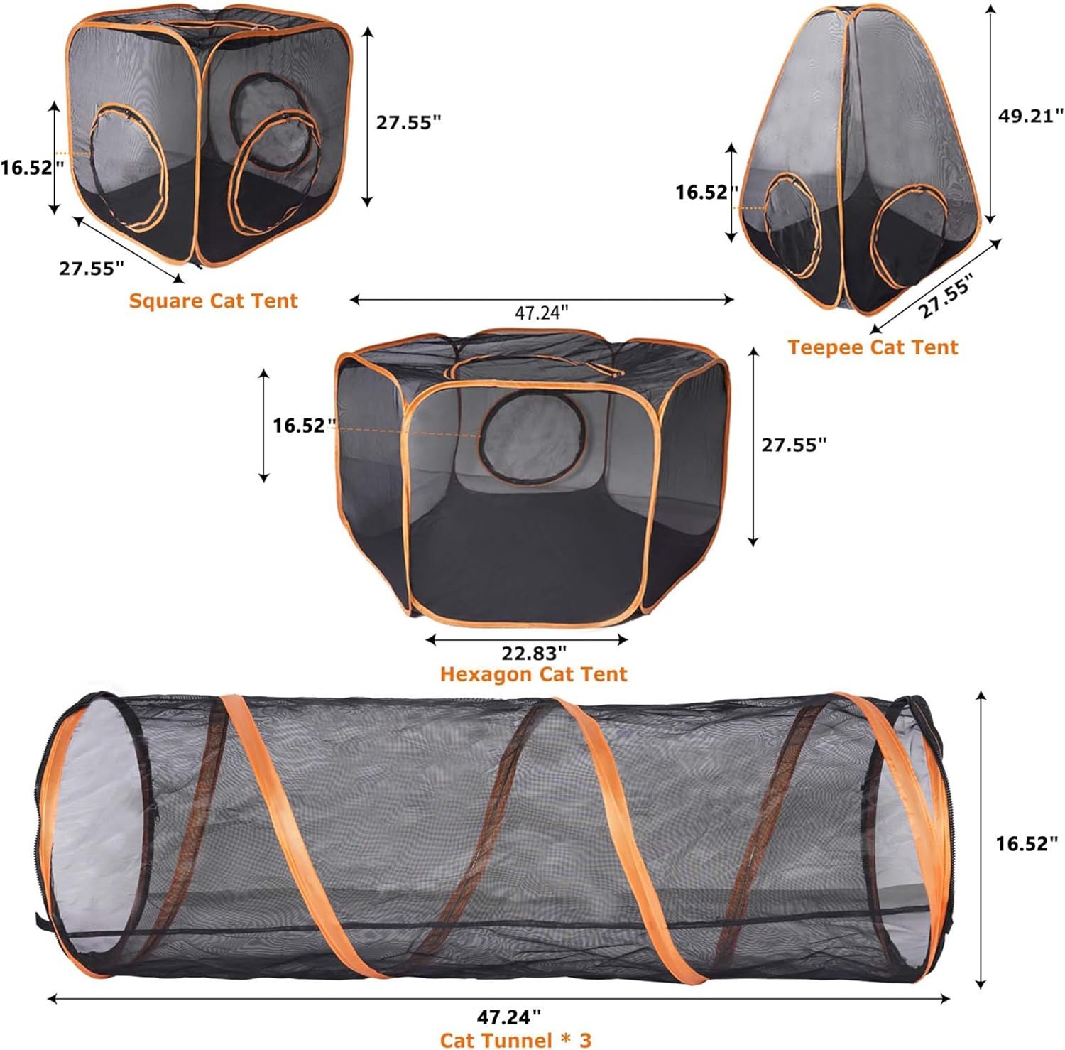 DELUXE AND ROOMY PET TENT—Square cat tent size:27.55×27.55×27.55 inch, hexagon cat tent size: 47.24×22.83×27.55 inch, teepee cat tent size:27.55×27.55×49.21 inch, one cat tunnel size: 47.24×16.52 inch. Great for multiple cats, puppy, rabbits, ferrets, guinea pigs and other small animals. It has quite a bit of space so they can chase each other and play without feeling hemmed in.
