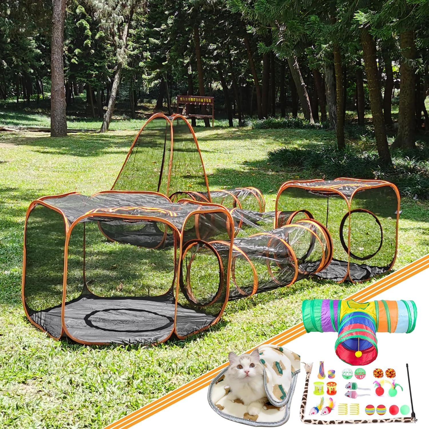 Kimruule Outdoor Cat Enclosures, The Balance Between Happy, Safe Cats and Protecting Wildlife, 6-in-1 Cat Tent Outside with Cat Tunnels for Indoor Cats, Large Cat Playpen Outdoor with 22PCS Cat Toys and Small Pet Blanket for Cats Rabbits Ferrets Dogs and Small Animals. Mesh Screened Cat Tunnels Have Given Your Cats Lots of Freedom Outdoors. To Play All Day and Enjoy Being Outside, There is Plenty of Extra Space for Toys, Treats, Litter Box, and Even a Cat Bed and Cat Tree.