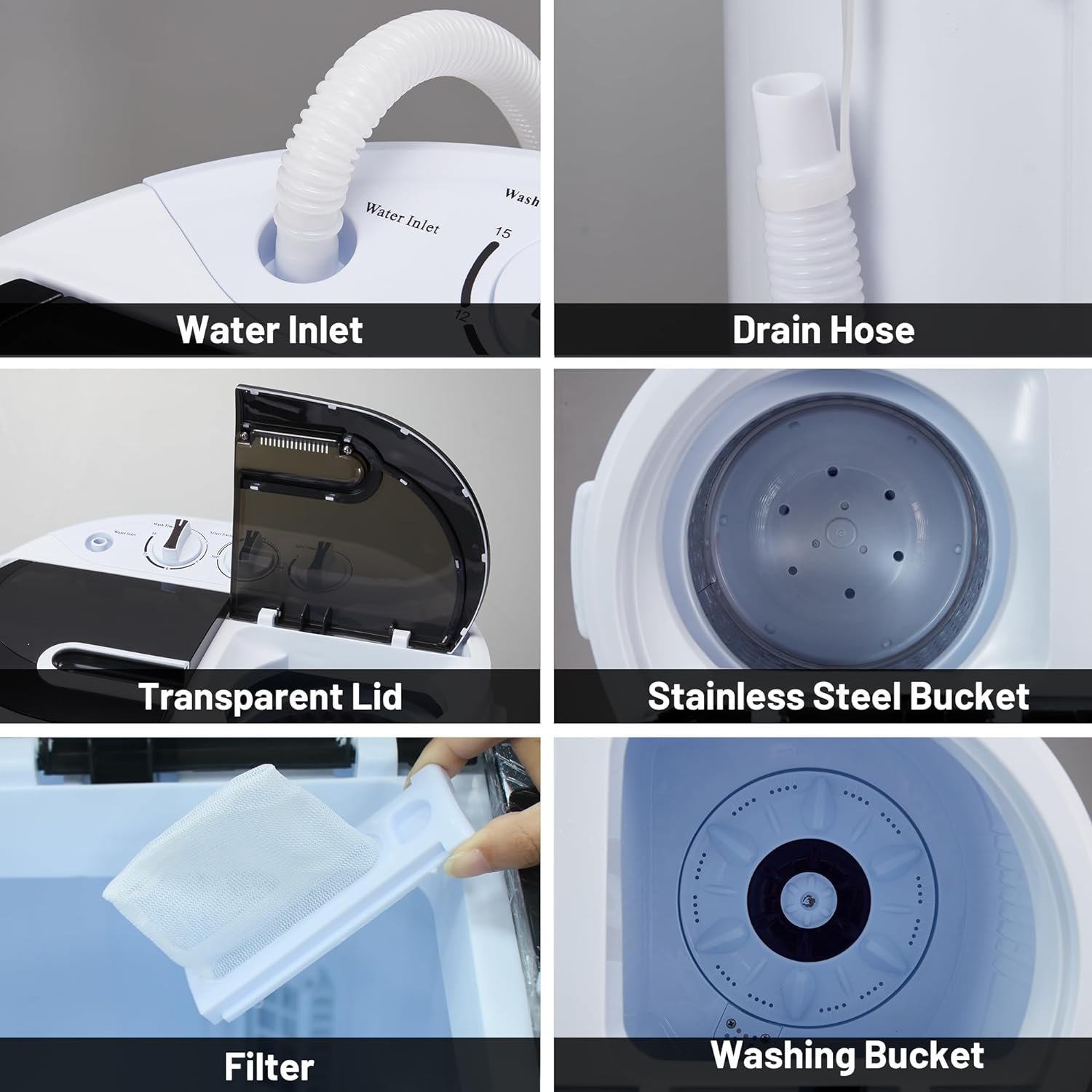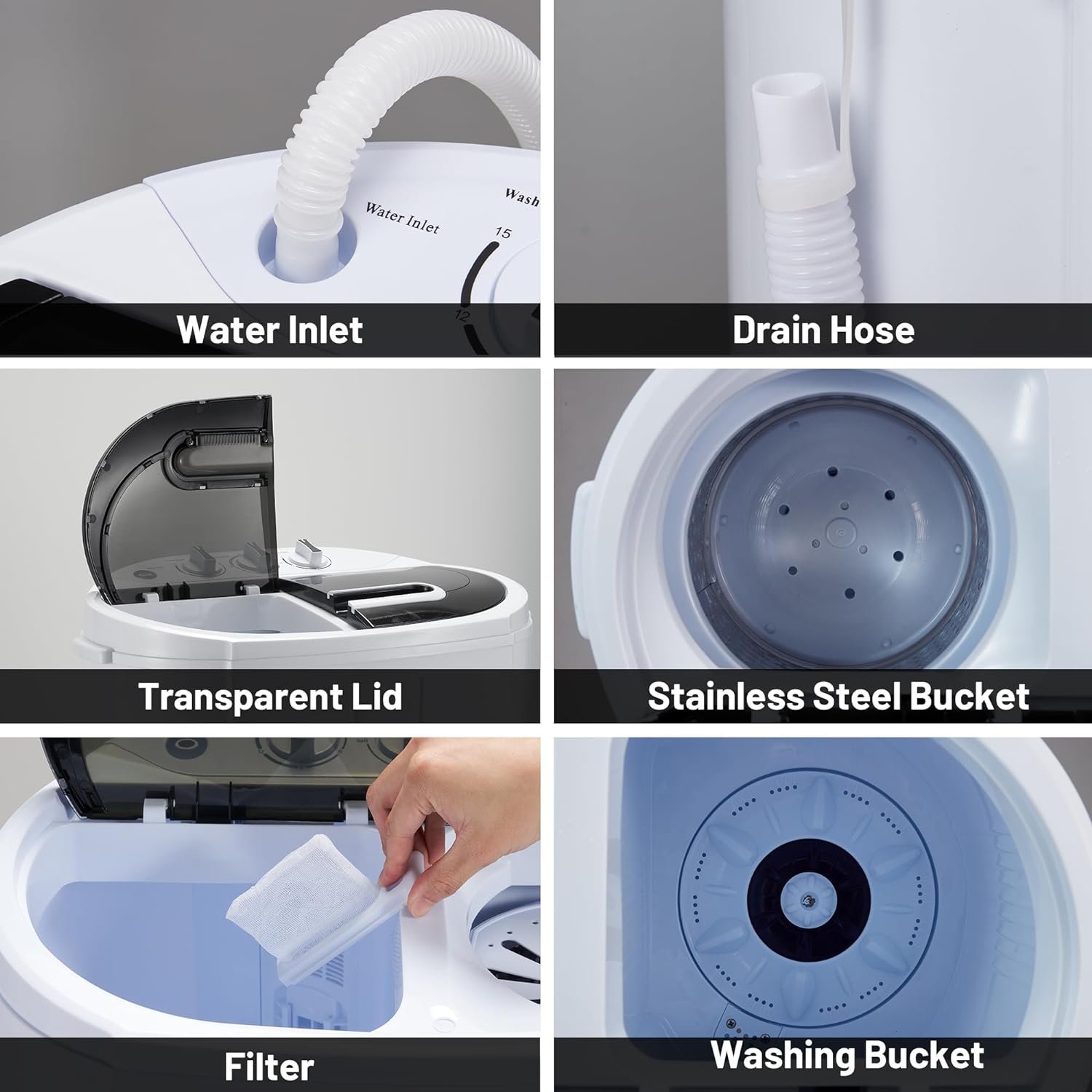 ⏰【Tips】1* Compact washer,1* inlet hose,1* drain hose,1* manual,1* fastener,1* filter.If you have any queries with the machine, feel free to let us know.We have a professional group to help resolve.