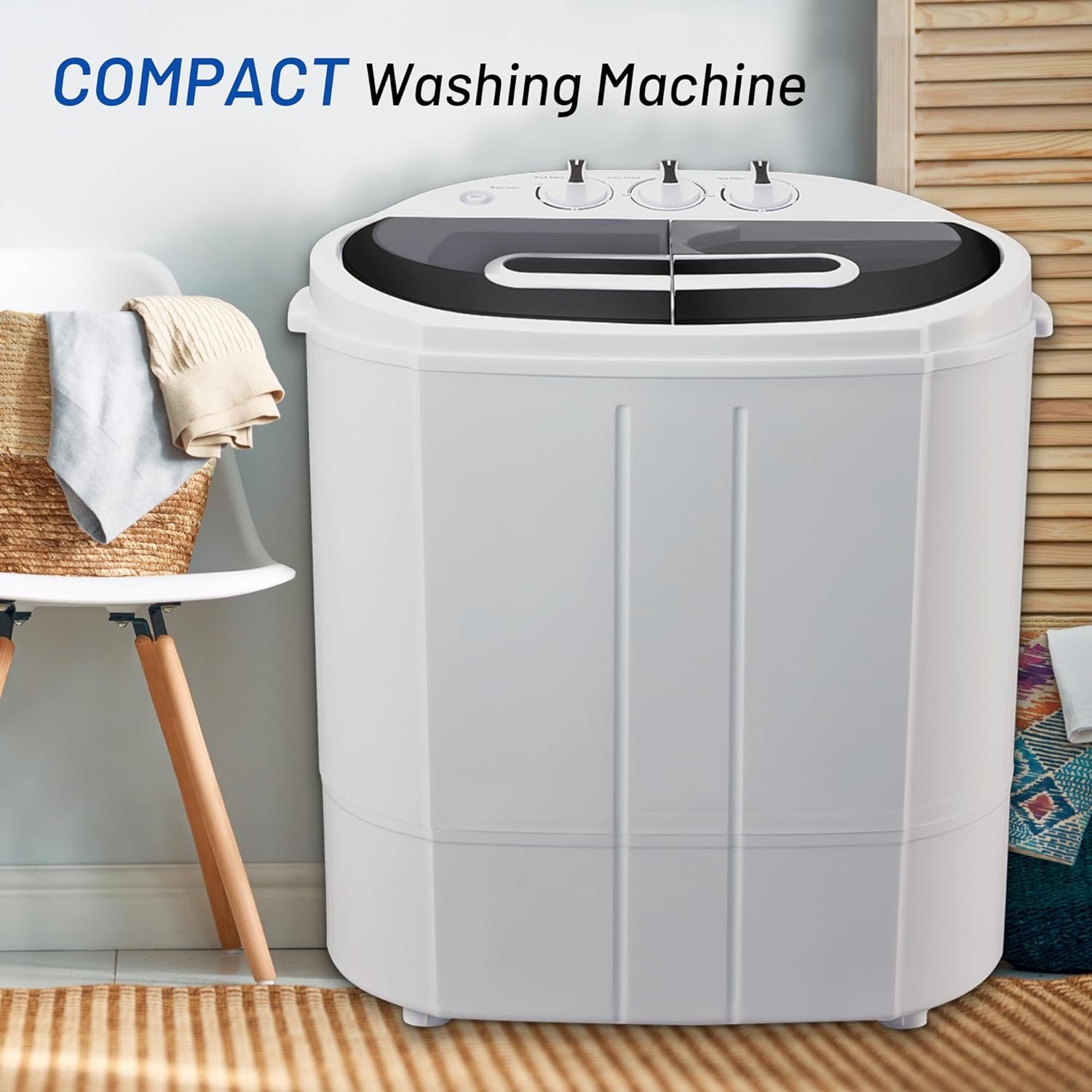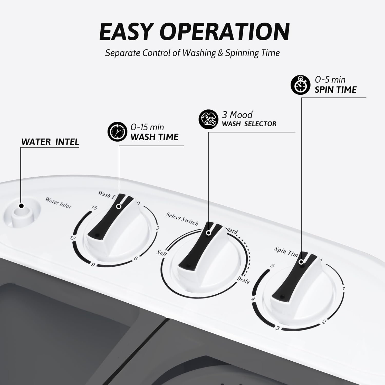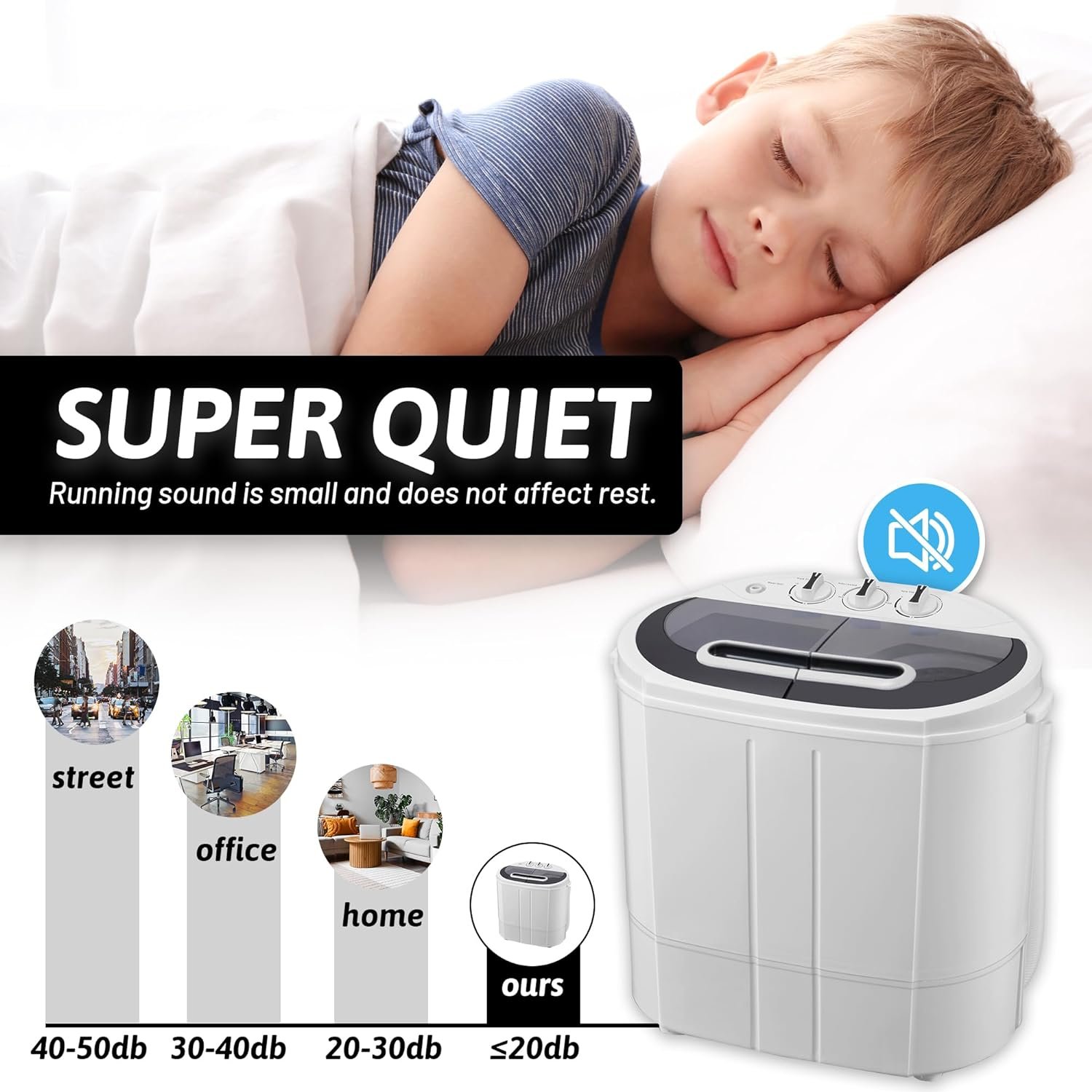 👕【Easy to Operate】This mini washer and dryer has 3 knobs, you can select washing time, spinning time, and washing modes. When the dry tub of the clothes washing machines is working, you open the lid of the dry tub, it will immediately stop rotating for maximum protection.We have prepared a detailed user-guide for you.