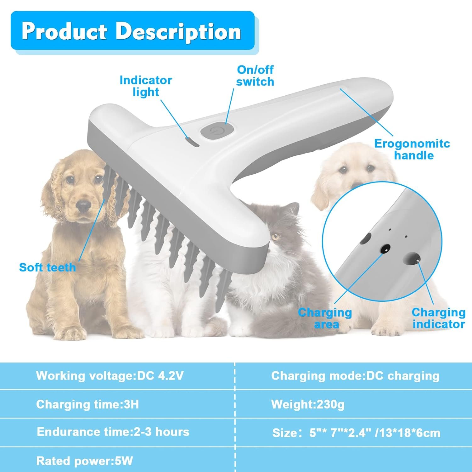 Safe Power-off Protection: The electric pet brush is suitable for DC charging, it can be used when charging. It has built-in power-off protection. If the electric brush may cause damage or danger when it is working, it will automatically turn off the power switch and stop operating.