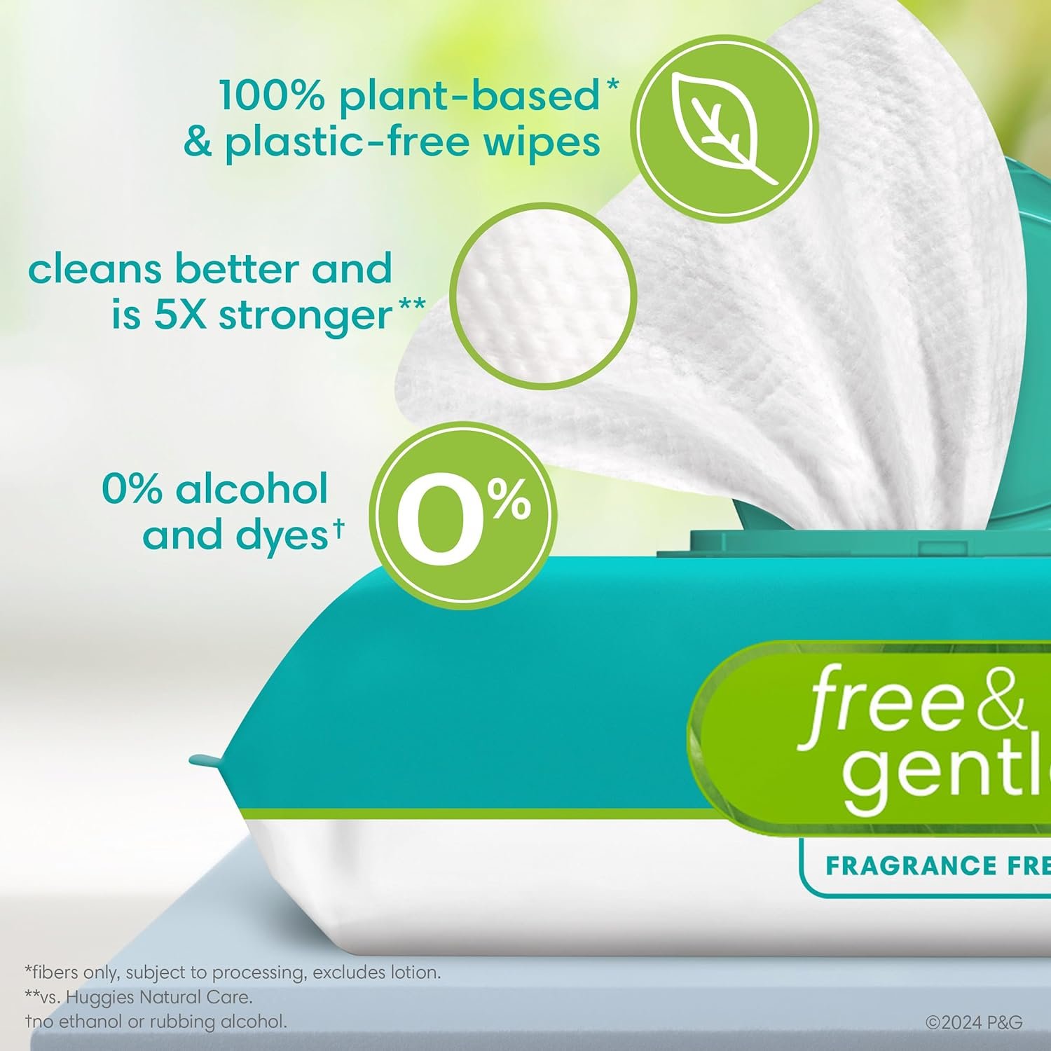 Pampers Free & Gentle 100% Plant-Based Fragrance Free Baby Wipes, 8 Flip-Top Packs (624 Wipes Total)