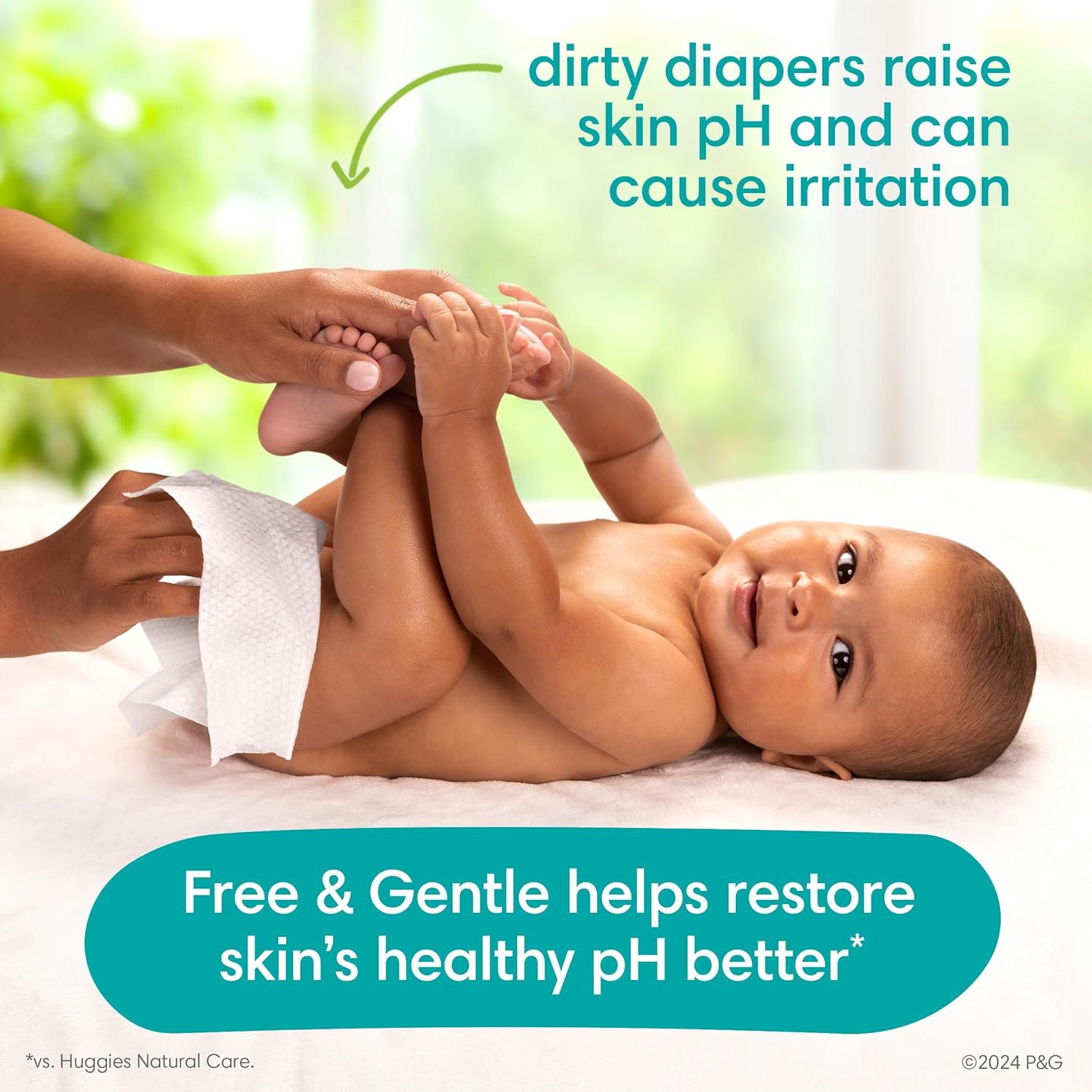 Clean skin is healthy skin. That’s why Pampers Free & Gentle Wipes clean better than the leading wipes sub-brand. And no more fear of tearing during a messy diaper change! Pampers Free & Gentle Wipes are 5X stronger* to help prevent tearing. These baby wipes feature a textured cloth that is made from 100% plant-based fibers and carefully designed to grip the mess while giving your baby’s delicate skin the extra care it deserves. Pampers Free & Gentle Wipes are hypoallergenic, unscented, alcohol free †, dye free, and plastic free. To help protect skin and prevent irritation, Pampers Free & Gentle wipes are infused with a gentle pH-balancing formula that restores skin’s healthy pH.