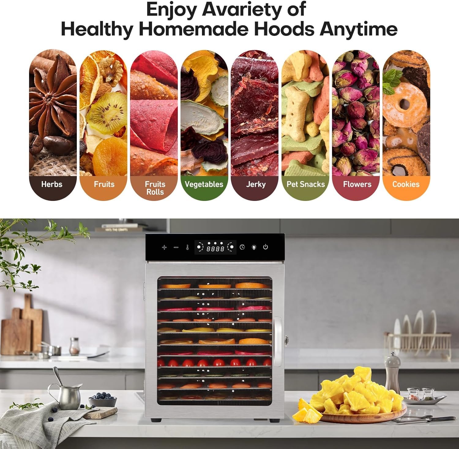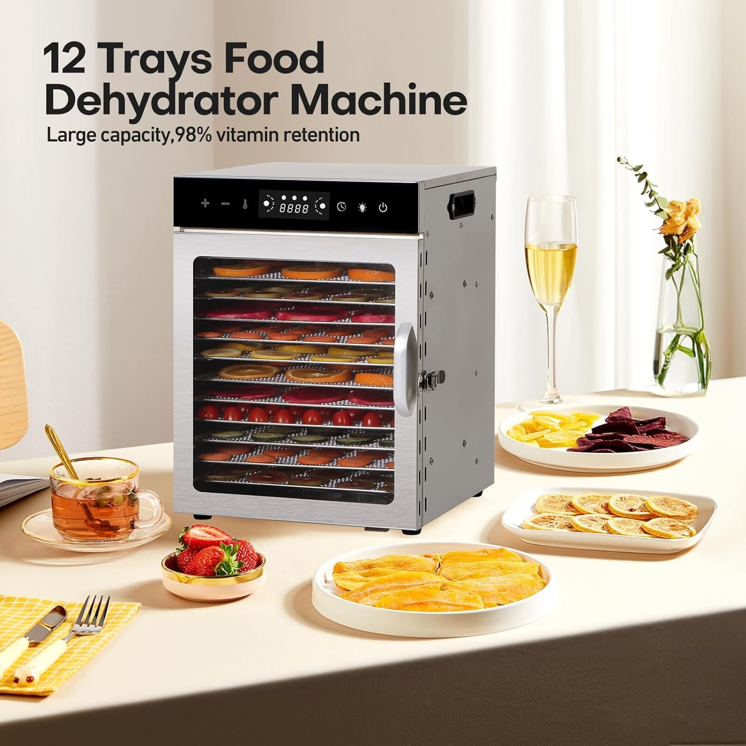 Premium Stainless Steel: Crafted from premium stainless steel, this dehydrator is not only durable but also adds a touch of elegance to your kitchen or workspace. The stainless steel material is food-grade, ensuring that your food remains safe and free from harmful chemicals.
