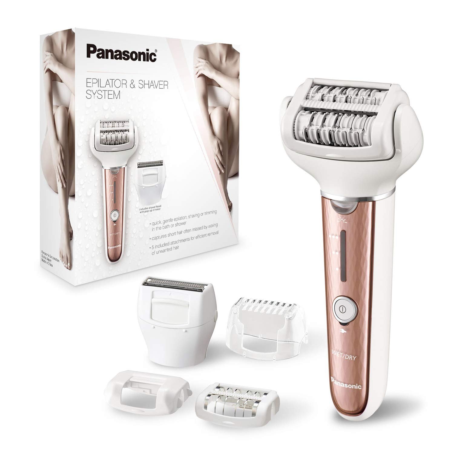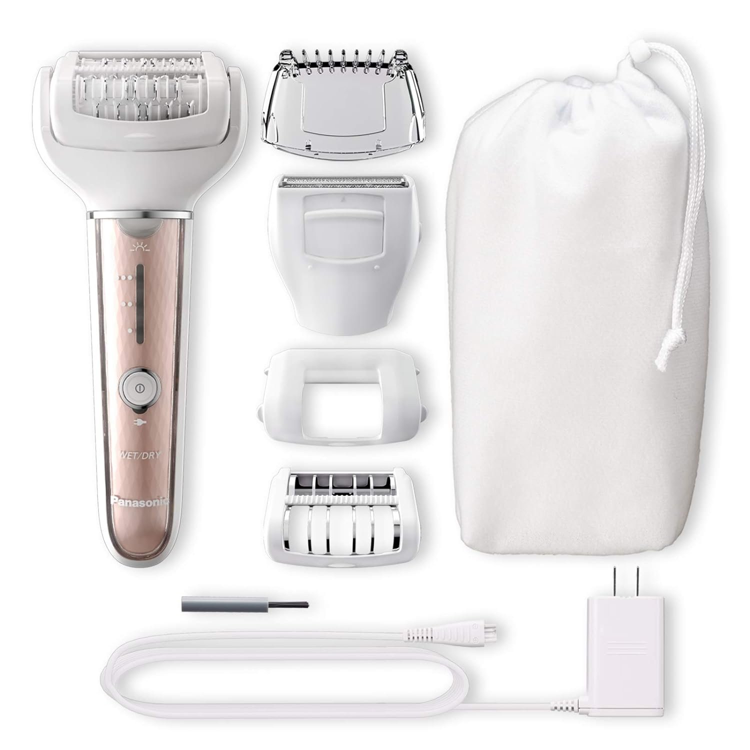 The Panasonic ES-EL7A-P epilator and shaver for Women Provides easy, full-body hair removal at home. It uses five different attachments to epilate, shave and trim. Attachments include an epilation head for legs and arms; gentle cap for gentler epilation; sensitive area cap for underarms and bikini line; and shaver head with slide-up trimmer. The main epilator attachment features a 1.25-In. Area of epilation to cover to efficiently capture and remove body hair from the root. Inside the head, rotating double discs with 60 hypoallergenic tweezers work in tandem to ensure hair not captured by the first disc is caught and removed by the second – even single stray hairs and hair often too short for waxing, as short as 0.5mm. A highly flexible 90˚ pivoting epilator head smoothly adjusts to your natural contours to remove hair from underarms, knees and other hard-to-reach places. This waterproof cordless wet dry women’s epilator and shaver is perfect for use in the bath. For a gentler epilation experience, simply apply bath gel to the epilator head and turn on to create rich foam which gathers around hairs to help make hair removal easier. For quick trims and touch-ups, use the Panasonic es-el7a women’s shaver and epilator dry for smooth, beautiful results. This versatile hair removal tool includes a sure-grip handle to ensure ease and control, three speed settings, A bright LED, cordless operation, cleaning brush and travel/storage pouch. Maintenance is quick and easy. Simply rinse the body and attachments under warm running water to clean. An included AC charger recharges the device in only one hour for 30 minutes of cordless use for hair removal at home or away.