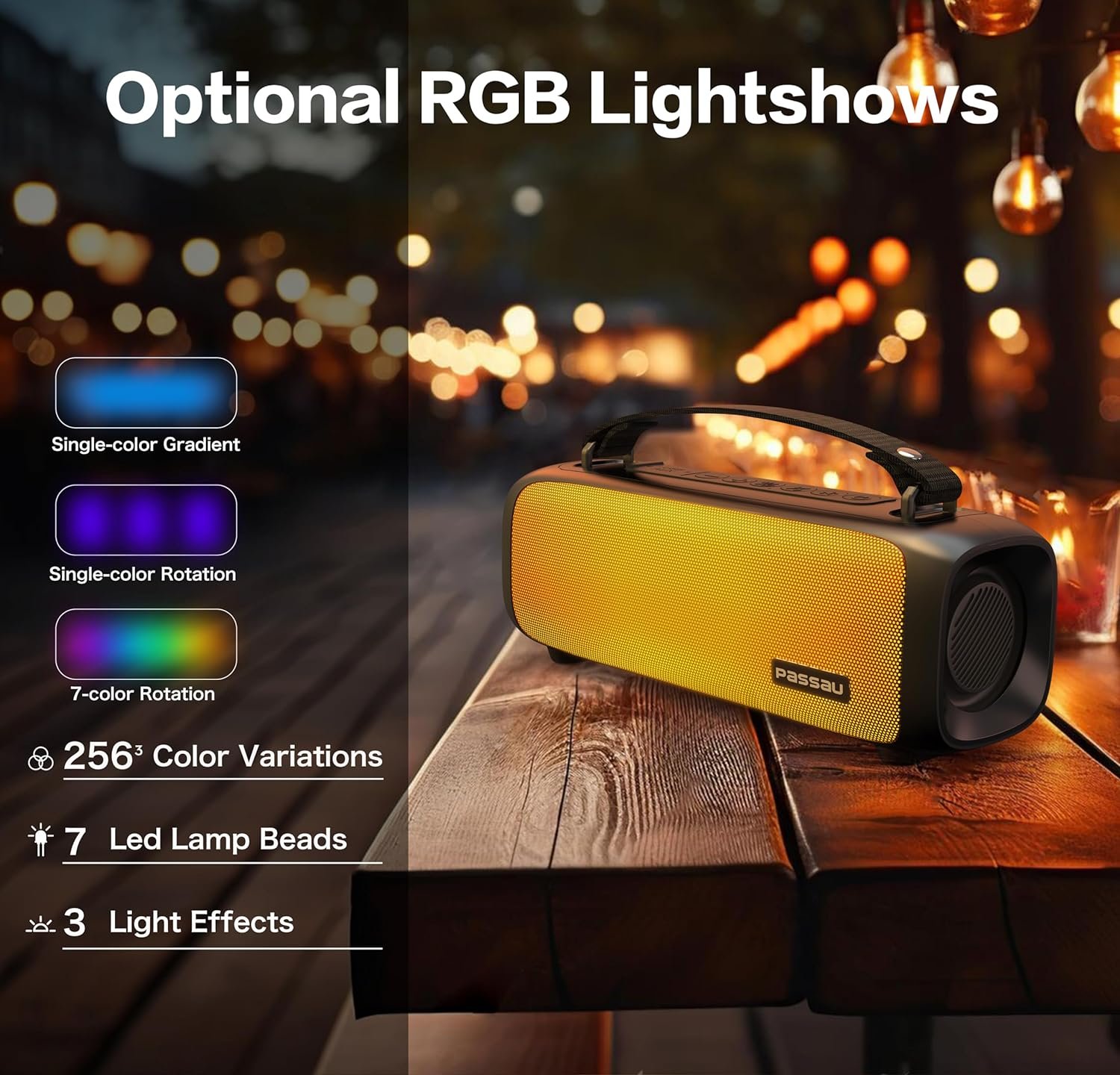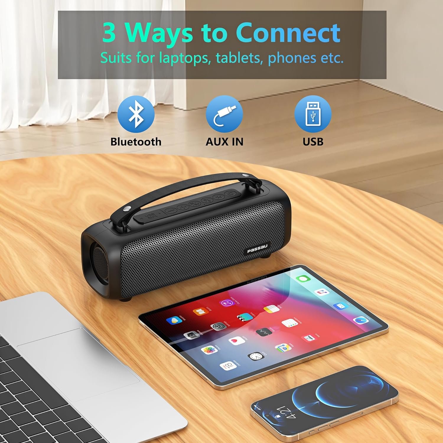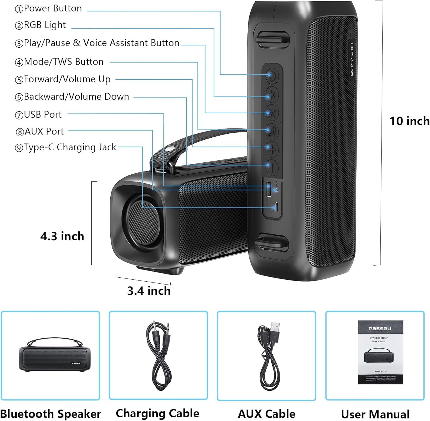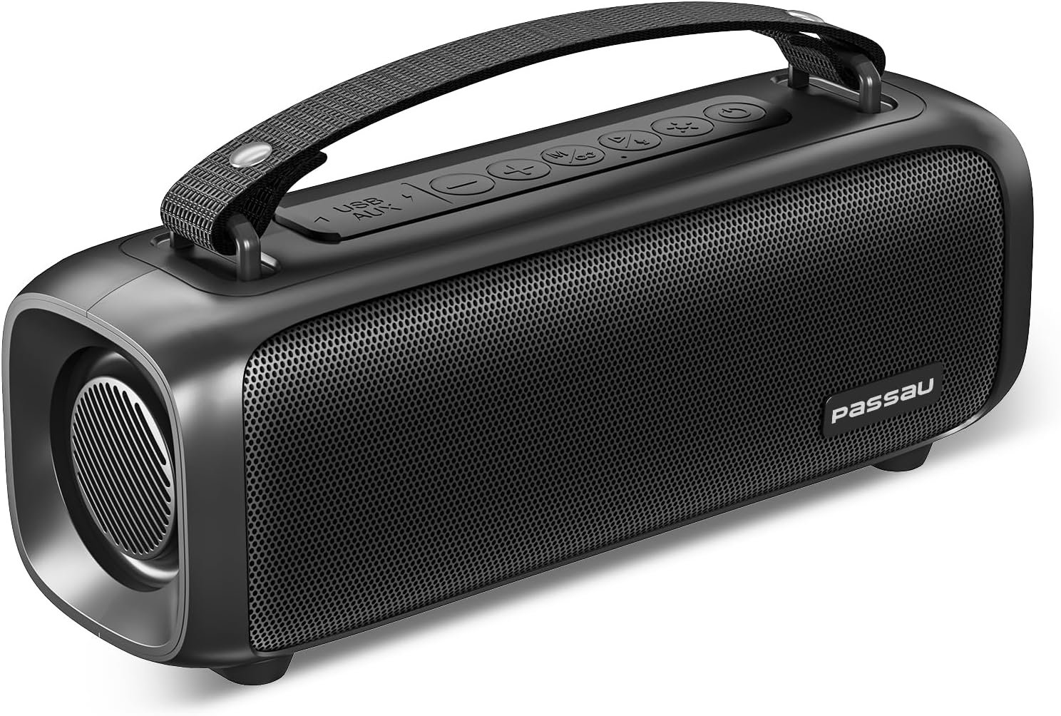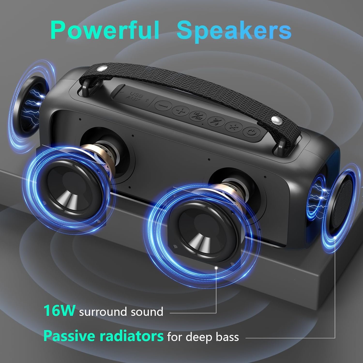 Clear Stereo Sound & Deep Bass Boost: Get Powerful stereo sound with 2 wide-range 32W(2x16W) drivers in outdoor speakers, dual passive radiators pumps out enhanced bass, strong mid, and crystal clear high sound without distortion at any volume. Enjoy ear catching music room-filling just like in a live concert, perfect partner for travel, parties, hiking, camping, and more outdoor/ indoors activities.