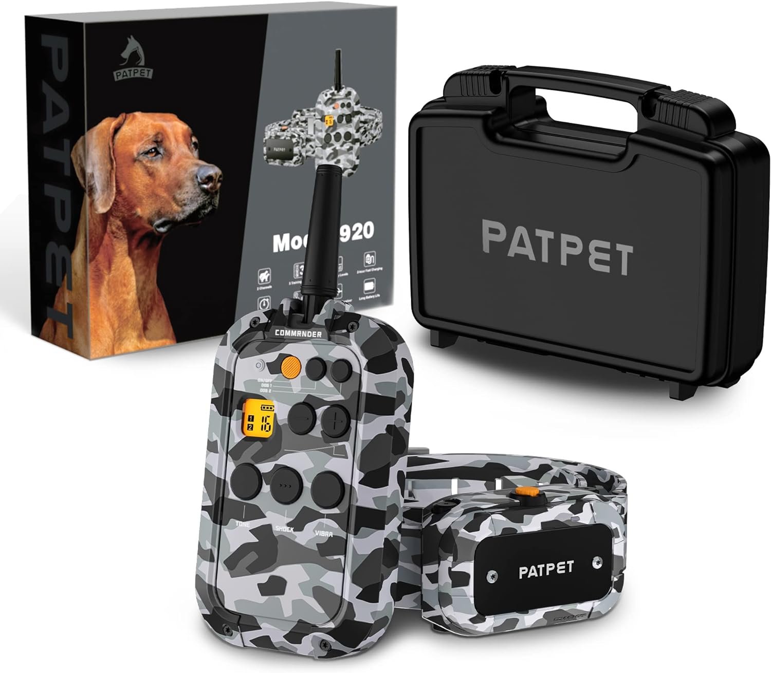 【Nice Gift & Luxury Enjoyment】Advanced Textured remote control is easy to use. Camouflage 920 is stored in a black storage toolbox, convenient to carry & easy to store. Patpet dog training collar is also a good gift for your friends or relatives who have dogs.