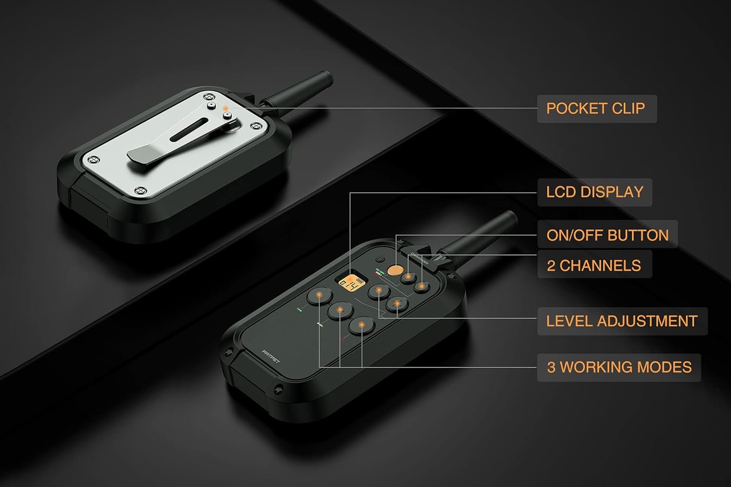 2 channels and 3 training modes. Designed for professional trainers to train stubborn dogs, supporting simultaneous control of 2 dogs.